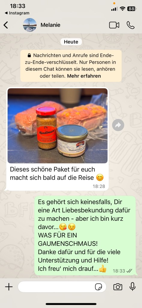 Als ich wieder zurück im Schiff war und bereits im Gemütlichkeitsmodus angekommen war, startete ein kurzer Chat in unserer Communitygruppe.