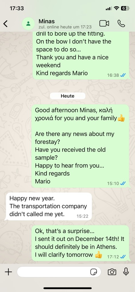 Tat es aber nicht! Am 02.01. hatte mein Ansprechpartner noch keinerlei Information, dass das erwartete und angekündigte Ersatzteil in Athen angekommen wäre.