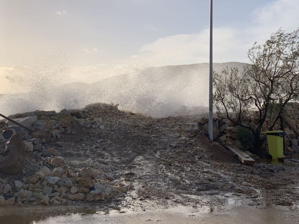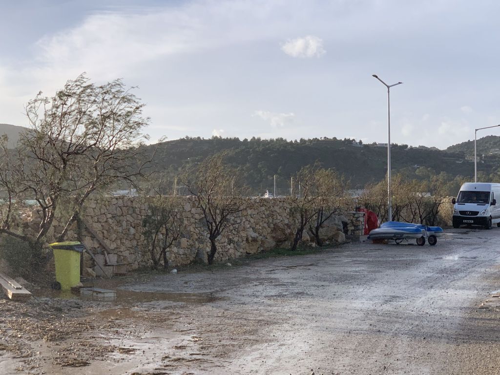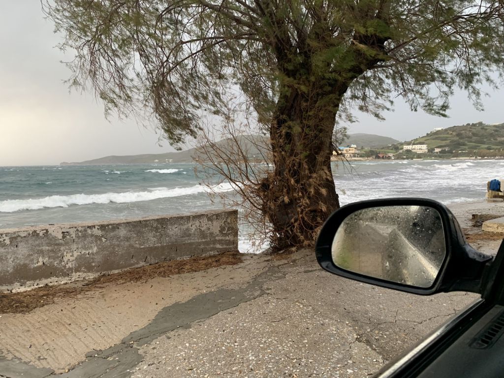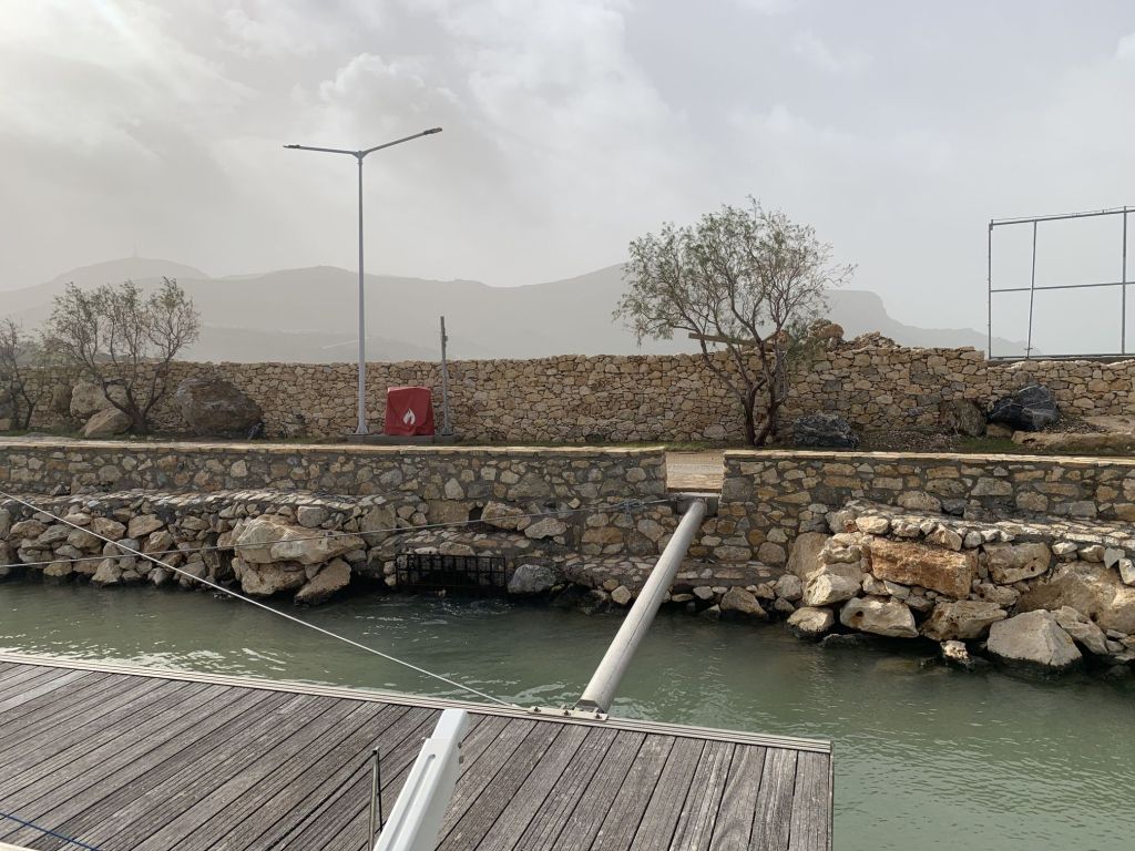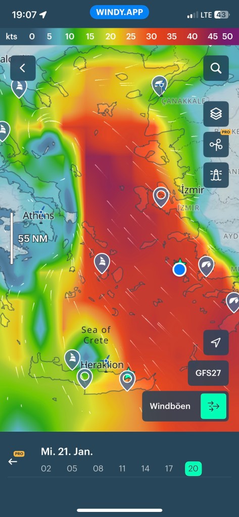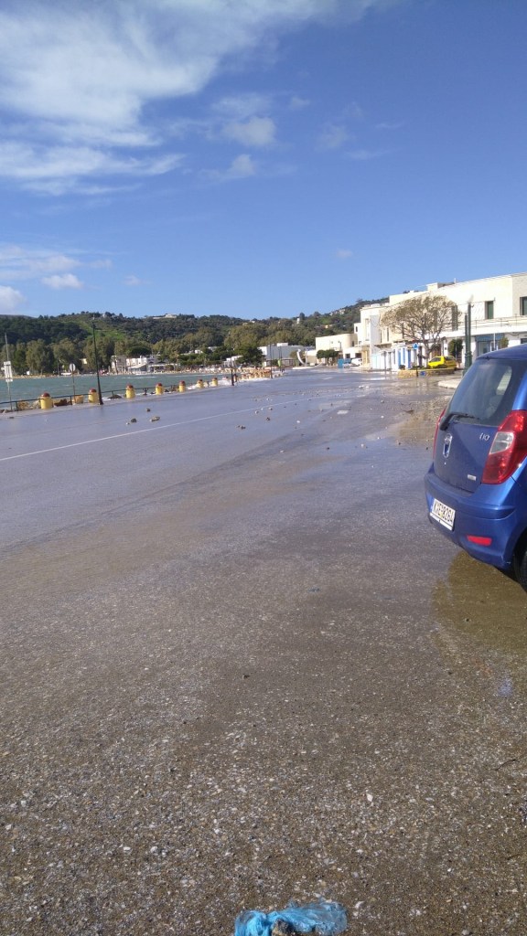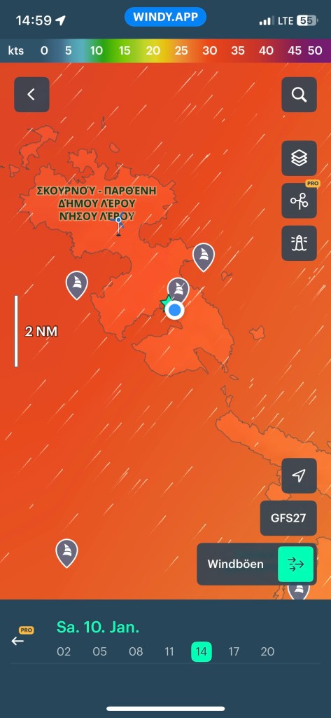 Der Wind hatte pünktlich eingesetzt und bläst mal wieder mit Böen bis zu 50kts. – dies hat zur Folge, dass die Uferpromenade von Lakki den dritten Tag in Folge überschwemmt wird.