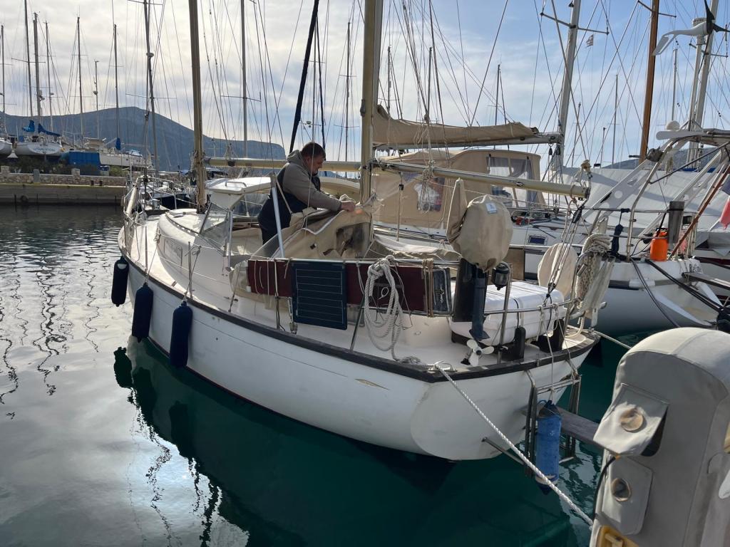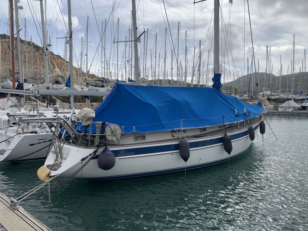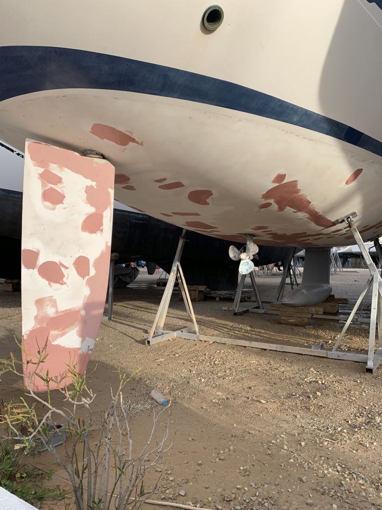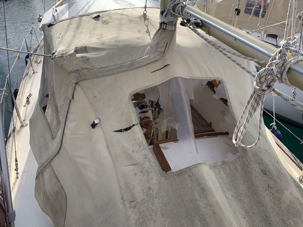 KEONDA ist unter einer Vollplane und die Segel sind im Salon.