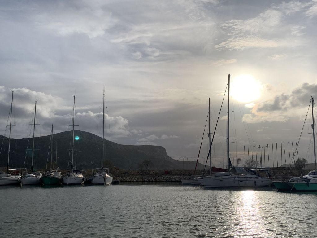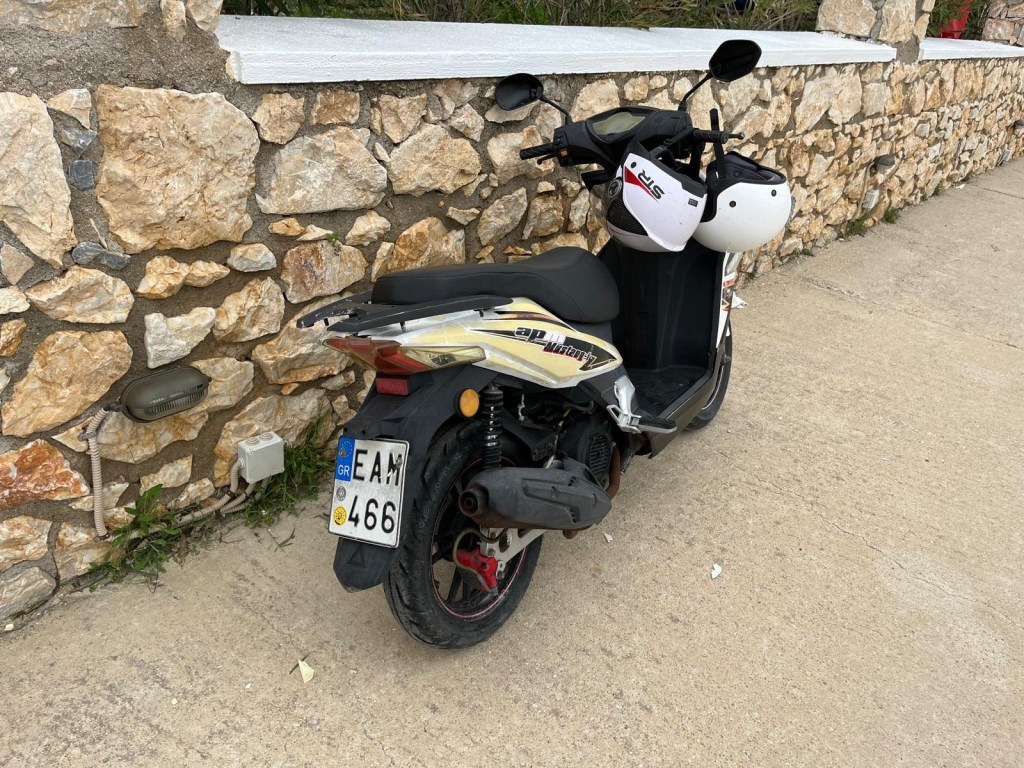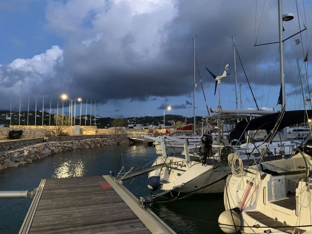 Der Folgetag war grau und wolkenverhangen – wir kommen auf unserer Marinarunde an einem Scooter vorbei, den unsere Freunde Rena und Ioannis vermietet haben.