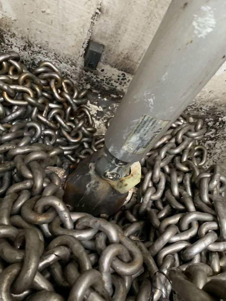 Als wir an Pits WUQI vorbeikommen, sehen wir, dass eine der Sicherungsketten ins Wasser baumelt.