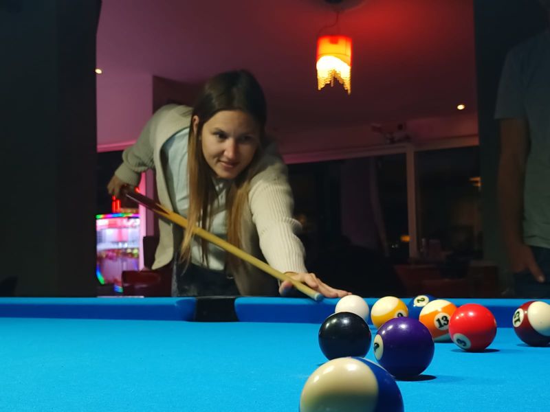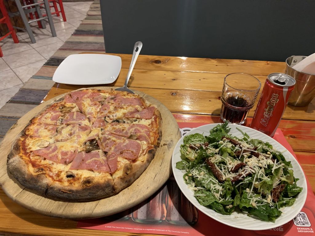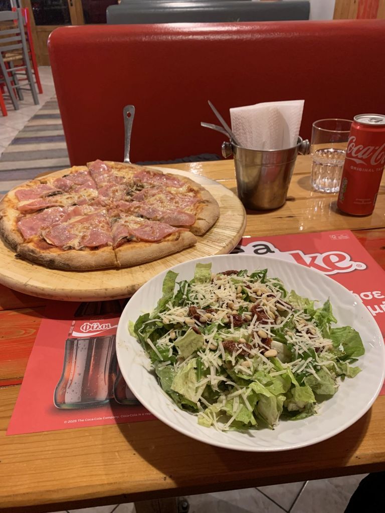 Ich will es nicht zugeben, aber wir telefinieren ZWEI Stunden und es ist schon 20.30 Uhr als ich zum Abendessen aufbreche – das Monats-Abschlussessen gibt es im „La Nostra“, ich gönne mir eine „Pizza Mario“ und einen Salat.