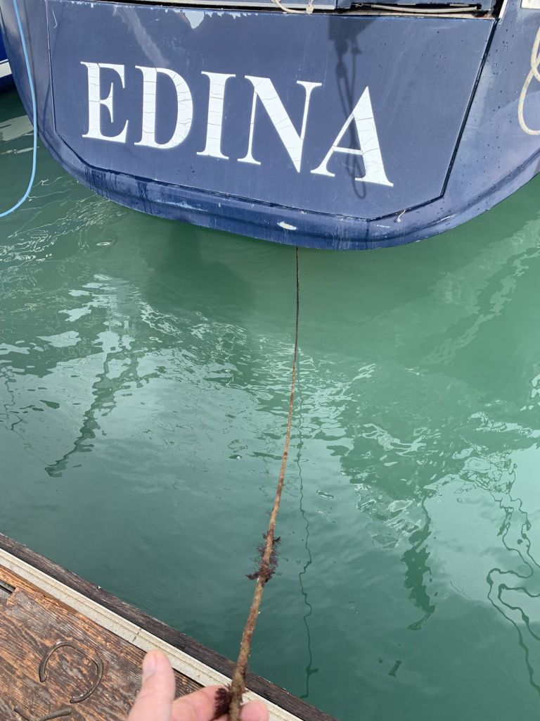 Als Patricia sich den Platz gesichert hat, habe ich ihr eindringlich geraten, die Bordwand mit drei großen Kugelfendern abzusichern – und was macht die beratungsresistente, störrische Frau?