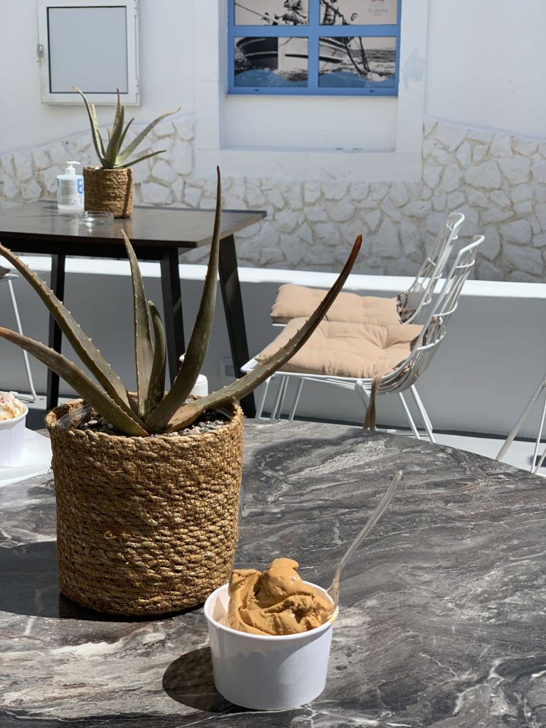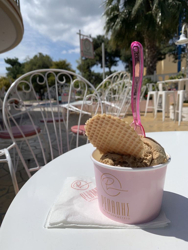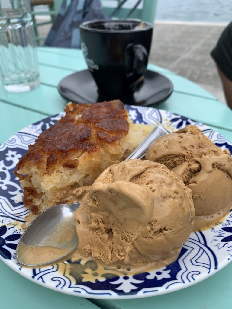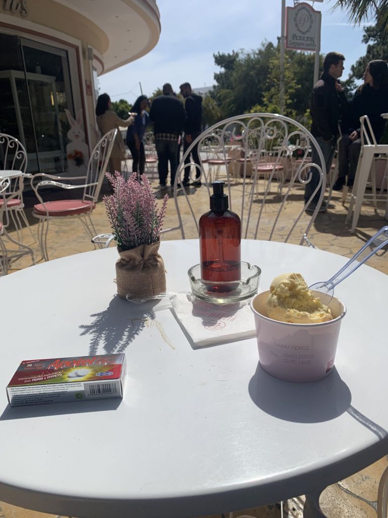 In Agia Marina haben wir eine Stunde Aufenthalt bis die Fähre kommt, die verbringen wir natürlich im „Το Παραδοσιακο“ und bestellen uns eine kleine Sünde – mir war es wurscht, weil Kalorien heute keine Rolle spielen, Sibylle war es wurscht, weil Geld heute keine Rolle spielt!