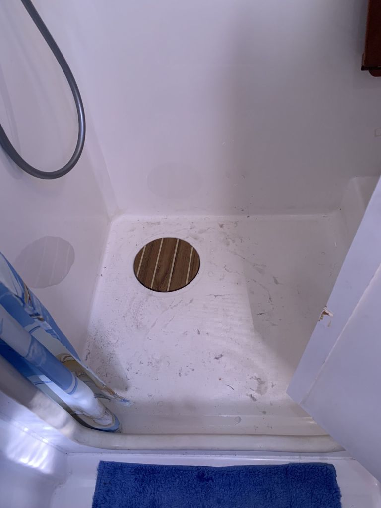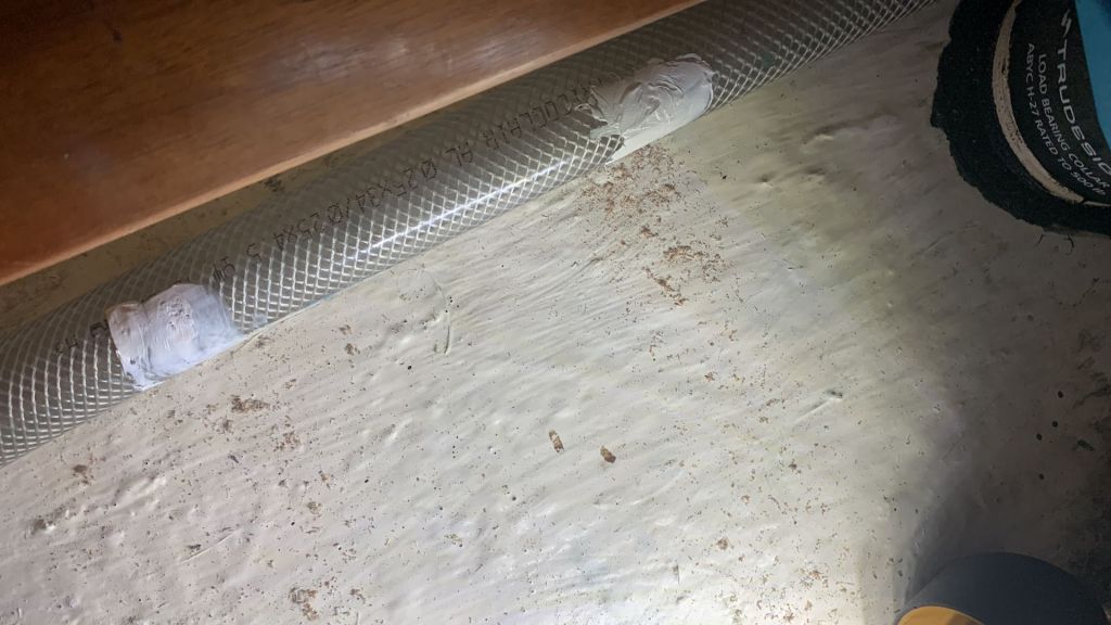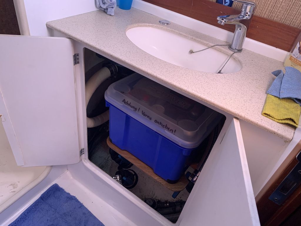 Wenn ihr mal bitte den Pfeil beachten mögt – das Brett ist massiv montiert und schwebt frei. Am hinteren Rand gehen zwei Bolzen durch das Brett und eine Art „Balkon“ unter dem der Schlauch meiner Bilgenpumpe verlegt ist – ich WEISS DAS, es ist genug Platz, eigentlich!
