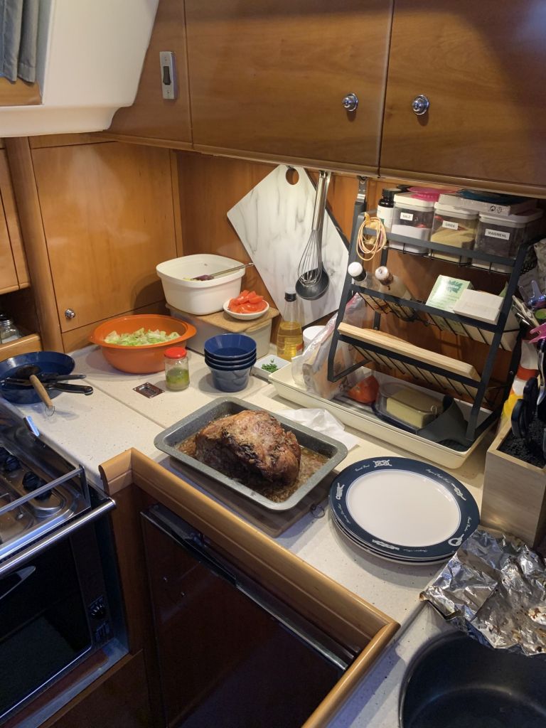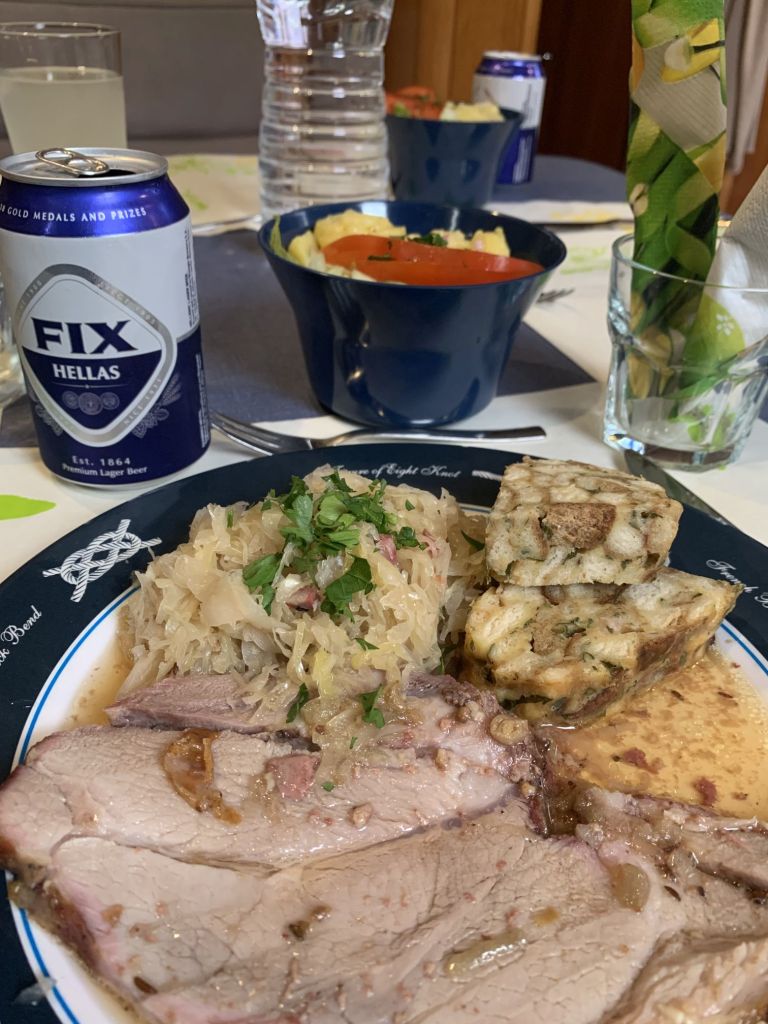 Am Abend stand eine langersehnte Einladung zum Dinner an, Evi von der OCEAN FANTASY hatte versprochen, dass sie einen Schweinebraten mit Serviettenknödel und Kraut machen würde. Dies sei als kleines Dankeschön gedacht, dafür dass ich den Winter über auf das Schiff geachtet hätte – das nehmen wir gerne an…