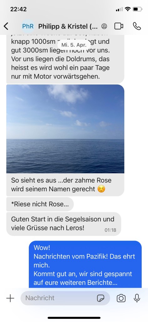 Bing! Mein Mobiltelefon klingelt mich an. So früh? Wer kann das sein? Ich bin überrascht und riesig erfreut gleichzeitig! Philipp & Kristel haben an mich gedacht und schicken mir Grüße und ein Bild von ihrer Pazifiküberquerung – live, also direkt vom Pazifik, aus der Weite des Oceans…
