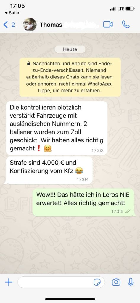 Kurz nach unserer Heimfahrt kam wohl die Polizei und hat Fahrzeuge mit ausländischen Nummern kontrolliert. Dabei wurden auch zwei Fahrzeuge konfisziert und die Besitzer erwarten hohe Strafen weil sie die sechs Monate maximale Aufenthaltsdauer mehr als deutlich überschritten hatten. Der rote Fiat wurde notiert.