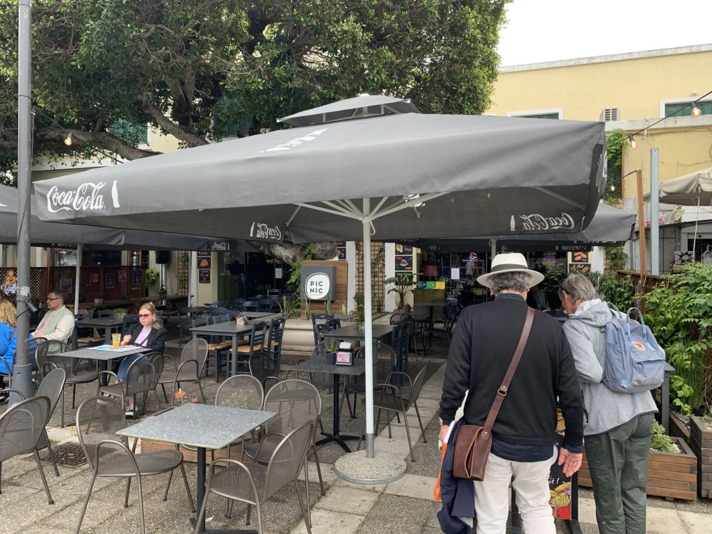 Wir gehen ins „Pic Nic“. Von außen nix Besonderes – und auch sonst nicht! Ich hätte gerne das Café der Marina vorgeschlagen, einfach weil das Ambiente stimmt und wir vielleicht die, nach eigenen Aussagen „…beste Bedienung der Welt“ wiedergetroffen hätten. Aber mein Mechanikerfreund Marios aus unserer Marina hat so vom „Pic Nic“ geschwärmt – naja, da waren wir anderer Meinung…
