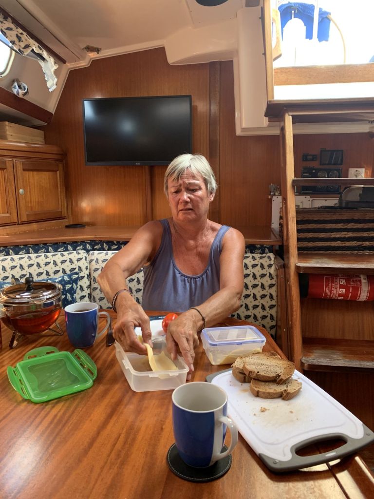 Ich kehre zu NESSAJA zurück. Sibylle ist inzwischen wach, sie hat das Frühstück gerichtet. Diesmal wieder Frühstück im Salon, oben scheint die Sonne schon hin, unten ist es (noch) frischer. Ich frühstücke meist nicht, mir reicht mein Schub Koffein.