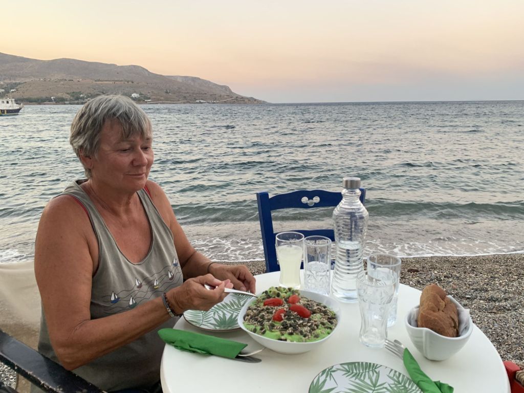 Sibylle und ich gehen noch in „Stis Anna“, dem vegetarischen Tempel von Leros um uns mal was anderes zu gönnen. Wir genießen den frischen Wind, die Stimmung und das gute Essen, sprechen aber weiter über Möglichkeiten und Chancen – wie so oft…