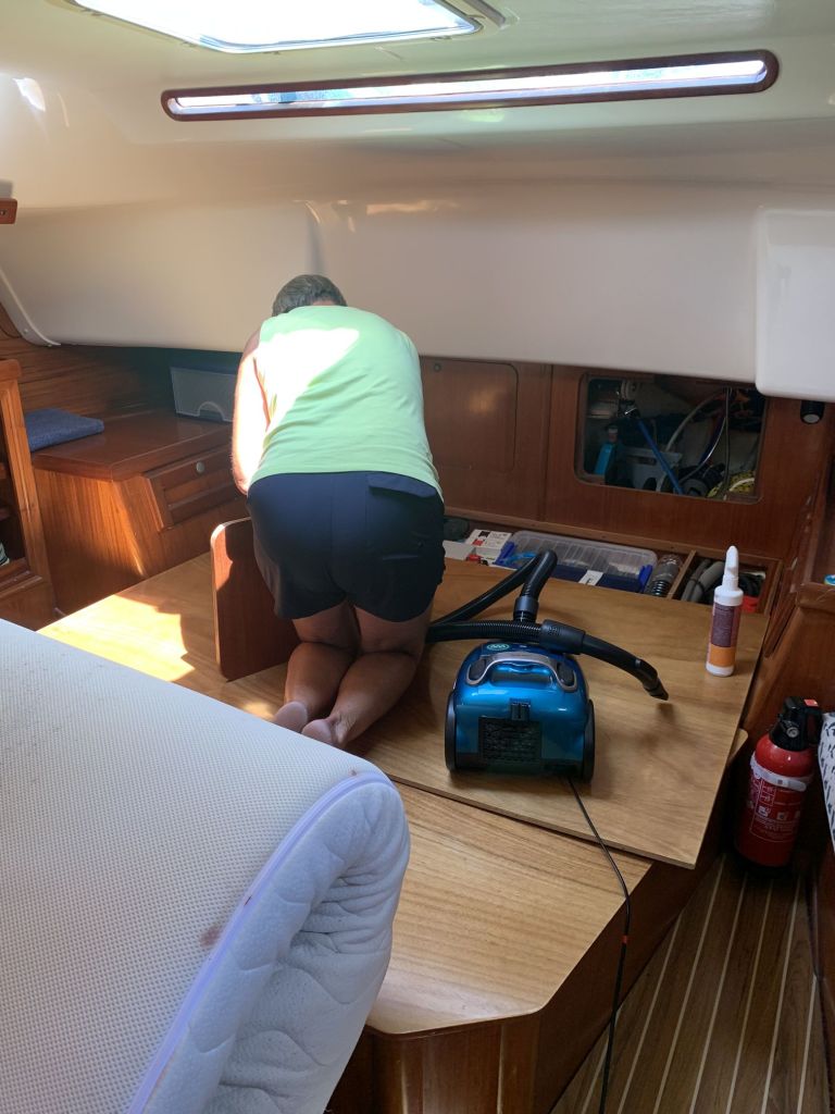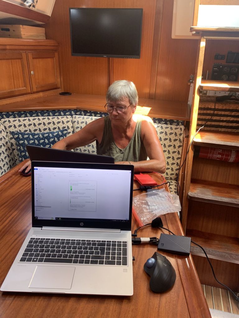 Das erledige ich heute – Eile ist nicht geboten, denn auf ELOWYN ist „arbeiten de Luxe“ angesagt. Egal wie warm es ist, ich schalte die Klimaanlage ein und werkle cool vor mich hin!