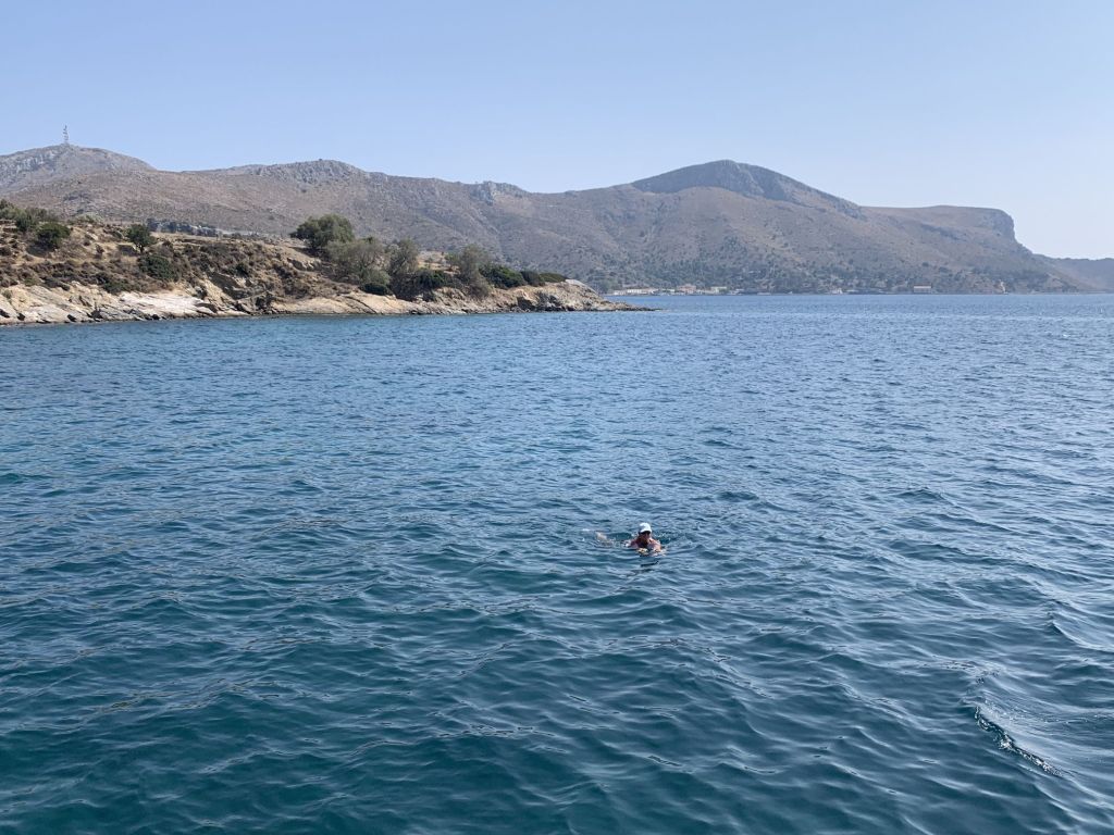 Sicher werden wir heute noch das ein oder andere Mal von der Kaimauer ins Wasser springen um uns zu erfrischen. Um 16.00 Uhr gibt es noch einen gemeinsamen Umtrunk, zu dem Hans-Peter geladen hat. Wir klönen noch ein bisschen, bevor wir uns artig verabschieden um in Lakki auf die Ankunft des blauen Kolosses zu warten. Abendessen gibt es an Bord der Fähre…