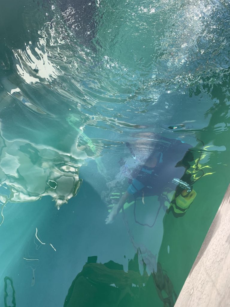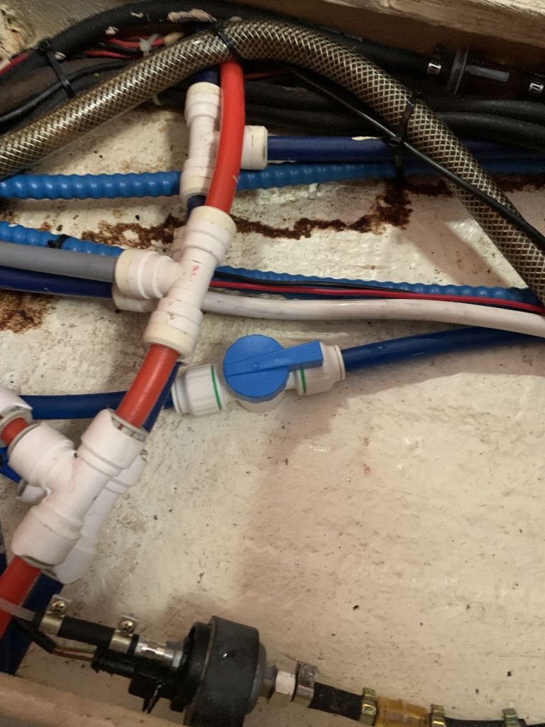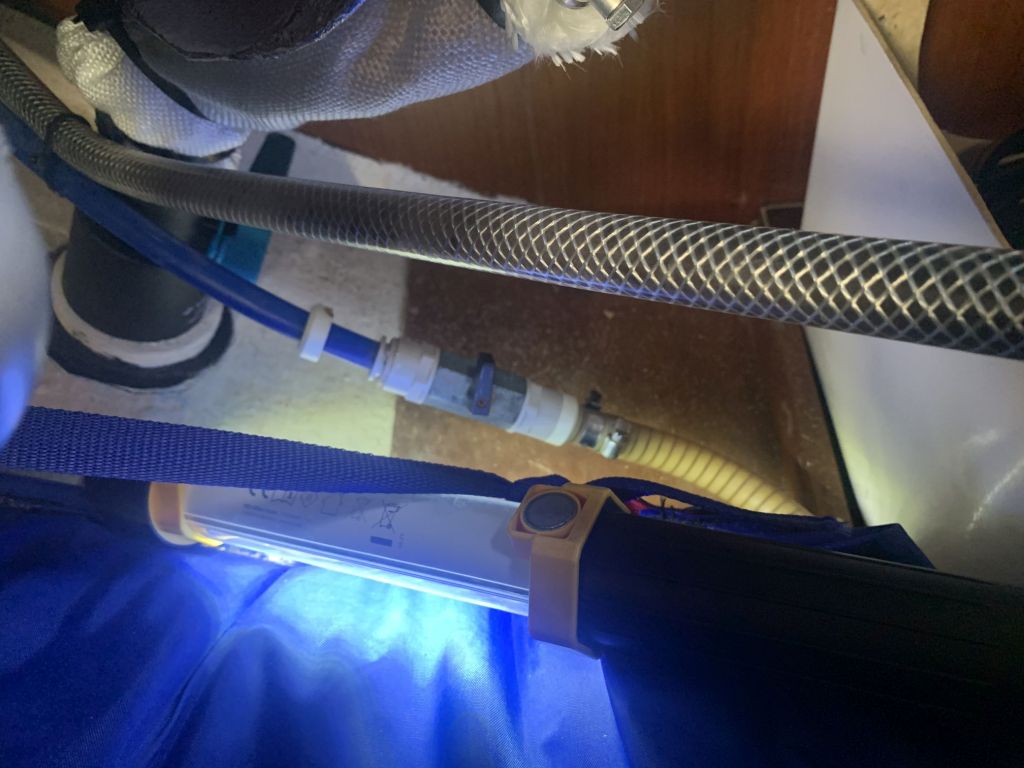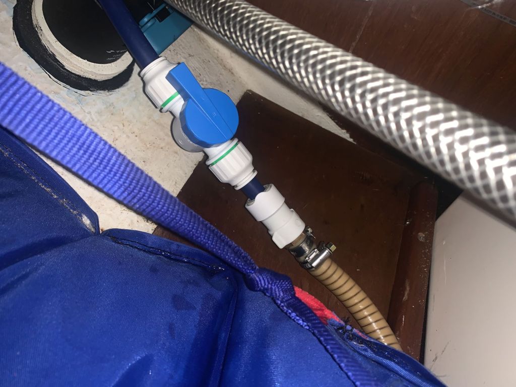 Am Nachmittag habe ich Zeit, mich der momentan erfreulich kurzen Aufgabenliste auf NESSAJA zu widmen. Wir haben gefunden, was zumindest mitverantwortlich für die reduzierte Entnahmemenge aus unseren Wassertanks ist – das System saugt Luft, sobald der vordere Tank leer ist. Ein Absperrhahn muss her!