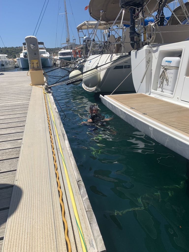 Nach dem Frühstück sehe ich nach ELOWYN, auch hier hat der kräftige Meltemi der letzten Tage Spuren hinterlassen. Der armdicke Ruckdämpfer war gerissen.