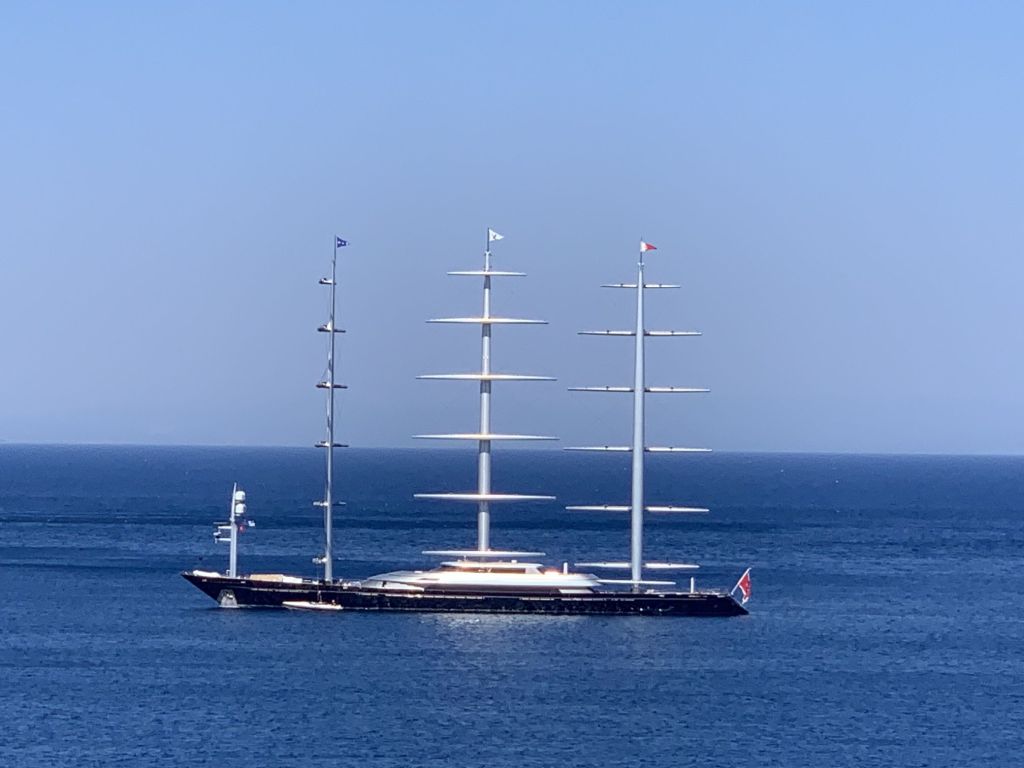 Auf dem Weg nach Hause, nehme ich aus dem Augenwinkel ein besonderes Schiff wahr, welches in Vromolithos vor Anker liegt. Ich entdecke die MALTESE FALCON.