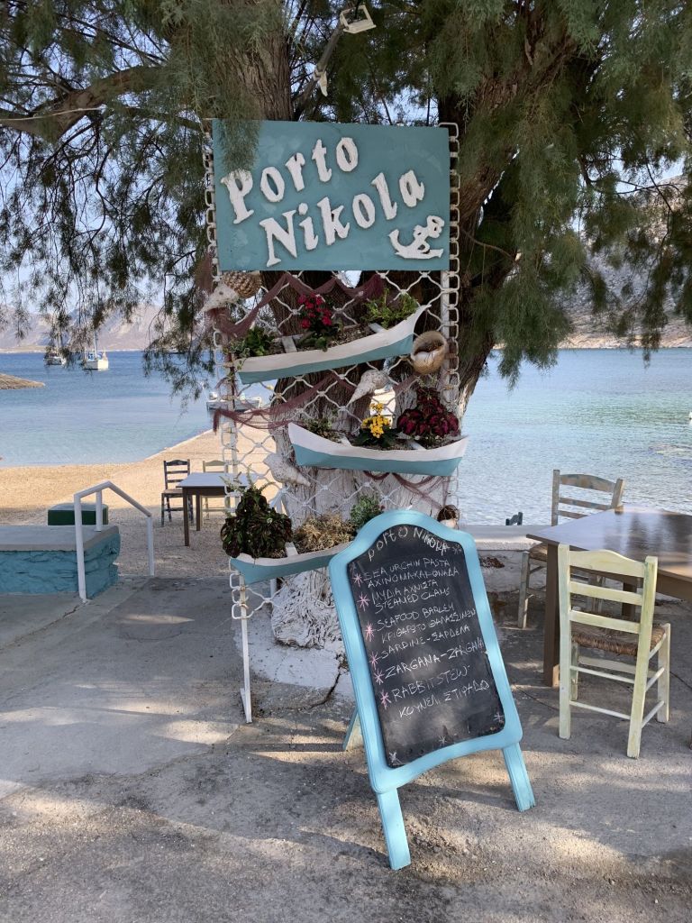 Am Folgetag möchte Sibylle am Nachmittag im „natürlichen Schatten sitzen und eine Kleinigkeit essen“ – na das lass´ ich mir nicht zweimal sagen – wir fahren nach Xirokampos ins „Porto Nikola“ und bestellen uns kalte Getränke und ein paar Meze.