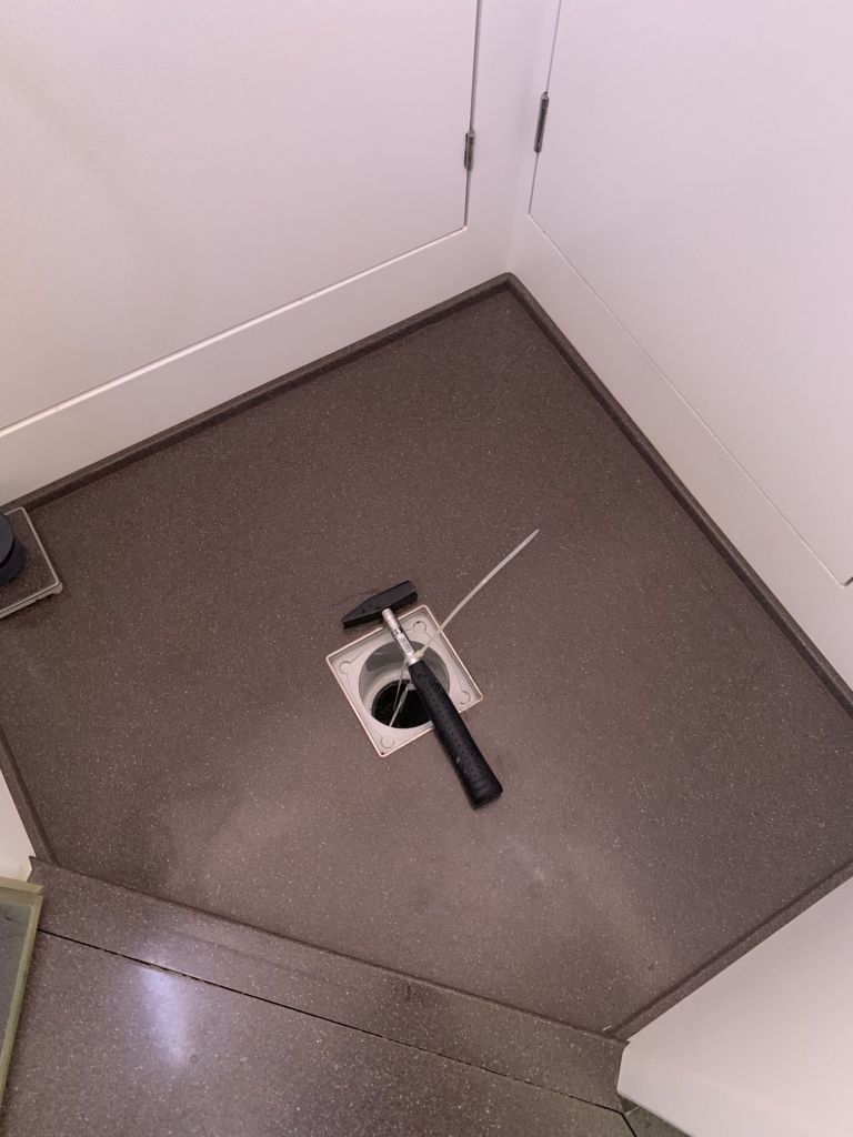 Ich habe beim Laden der Batterien von ELOWYN gesehen, dass ein Versprechen, welches ich Volker gegeben habe, noch offen ist. Ihm war beim Reinigen der Dusche ein Missgeschick passiert und er hatte den Ablauf samt Schlauch vom Abflussschacht der Duschwanne gedrückt – natürlich an schlecht zugänglicher Stelle.