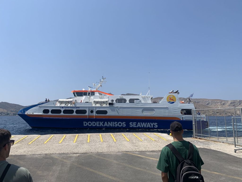 In Agia Marina angekommen, haben wir eine Stunde Zeit – die verbringen wir, wie eigentlich immer, im „To Paradosiakos“ und trinken einen Cappuccino und gönnen uns eine kleine, süsse Sauerrei. So vergeht die Zeit rasch und bald schon läuft der Katamaran von „Dodecanese Seaways“ ein – er wird unser Zubringer nach Kos sein.