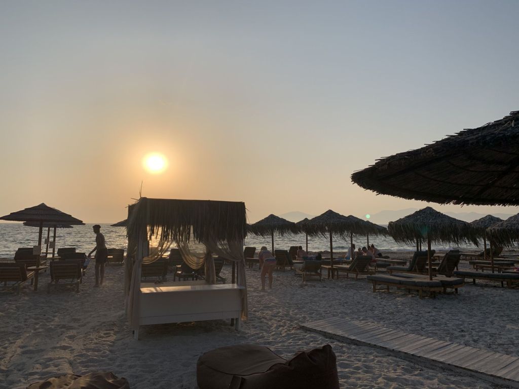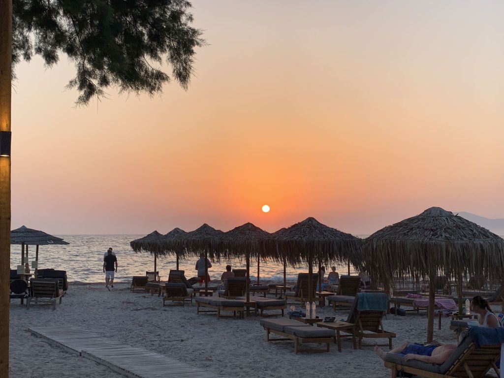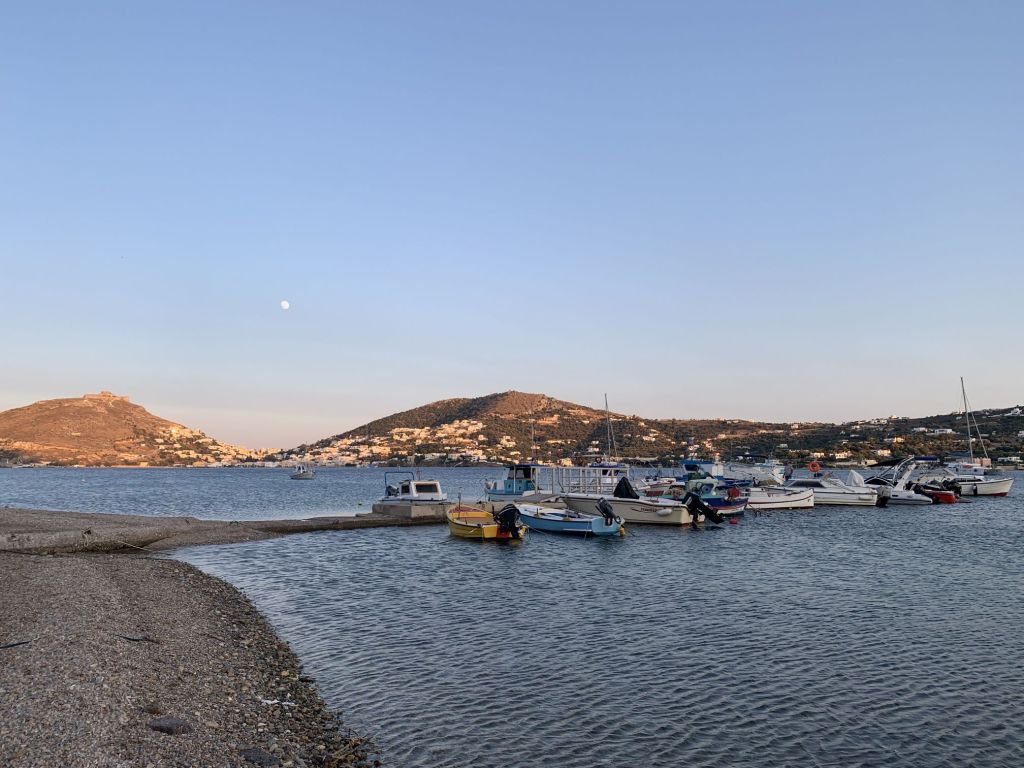 Am Abend gehen wir zum Essen ins „To Steki“ und freuen uns über einen Platz am Strand. Der Vollmond war schon zu sehen als es noch hell war…