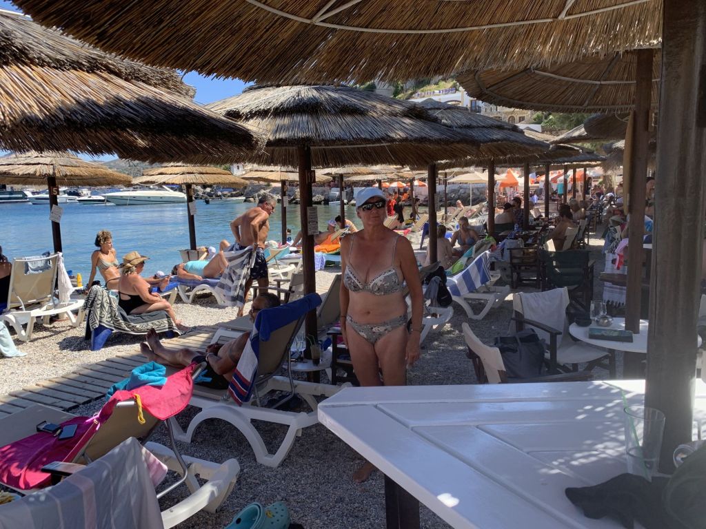 Weil uns der Schweiß in Strömen über den Körper rinnt, fahren wir mit dem Mopped zum Lieblingsstrand nach Panteli. Aber so schlau waren andere auch – der sonst so idyllische Beach war zum ersten Mal ziemlich angefüllt.