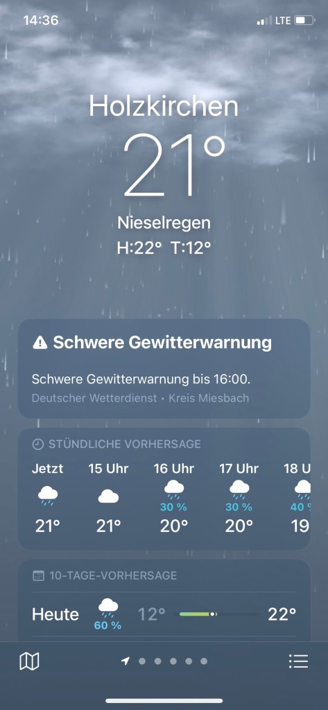Bayern, unser Heimatort Miesbach, empfängt uns ungastlich. Kurz nach einem Hagel, müssen wir im Regen zum Auto hasten um nicht völlig durchnässt zu sein. Die Begrüßung findet erst zuhause statt…