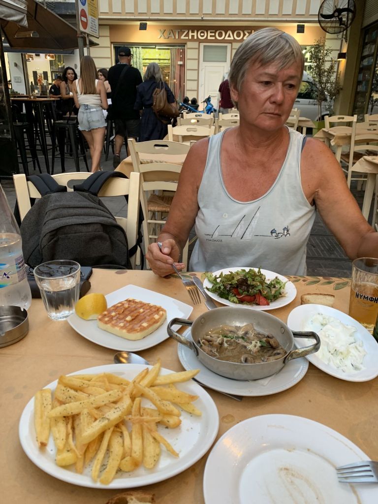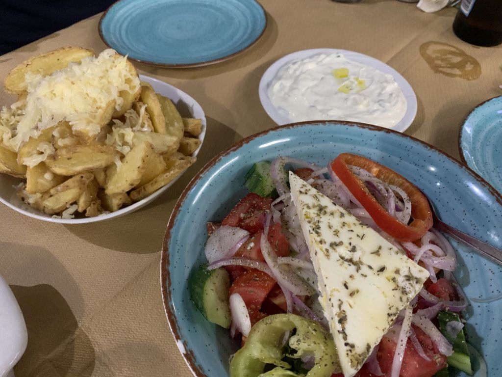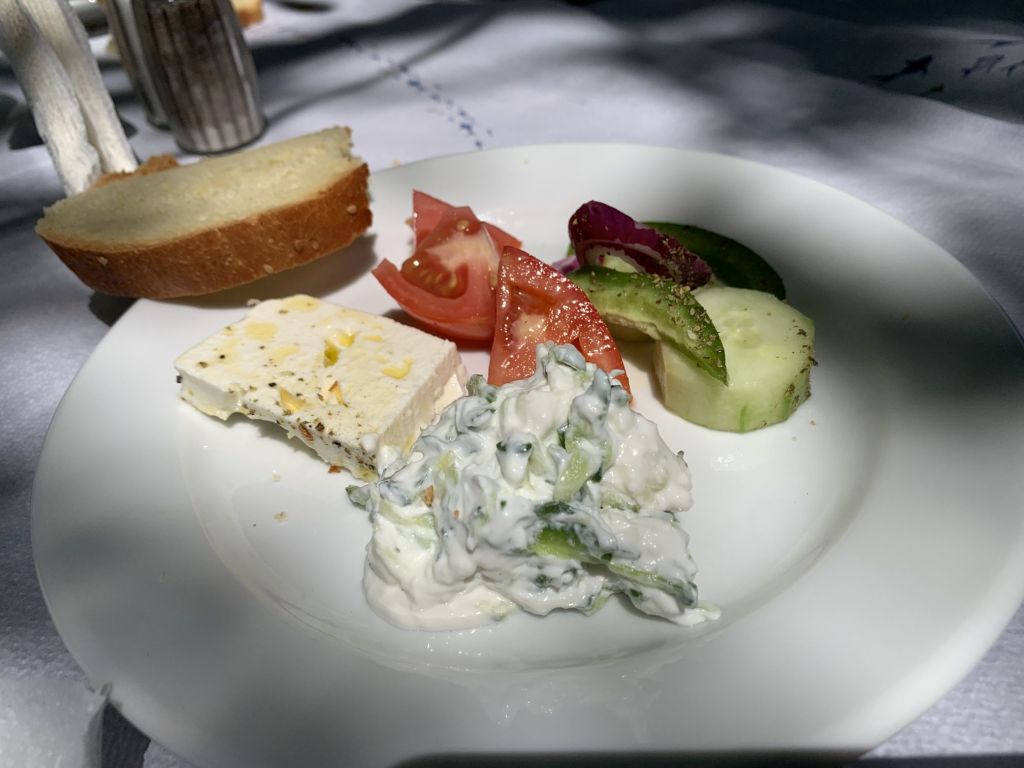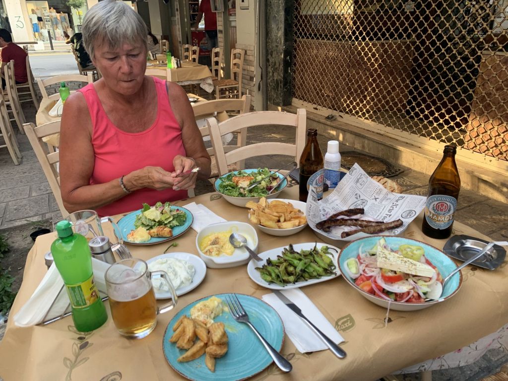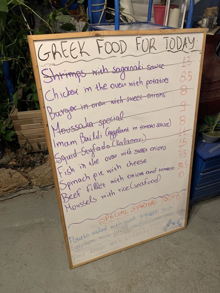Wir gingen zum Dinner in die empfohlene „typische und urige Taverne in der man noch authentisch griechisch essen kann“ – genau was wir suchen!