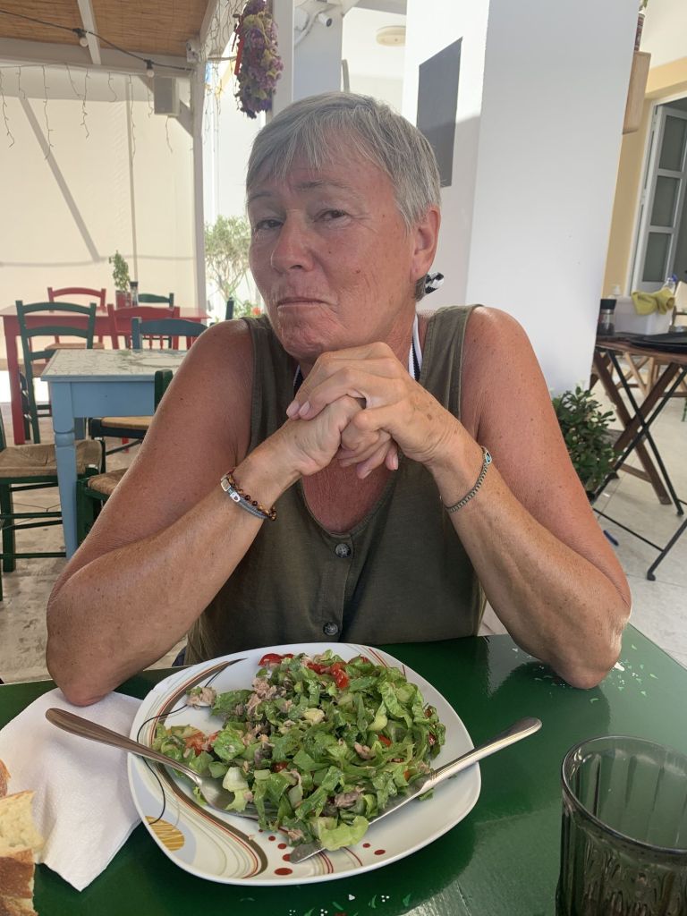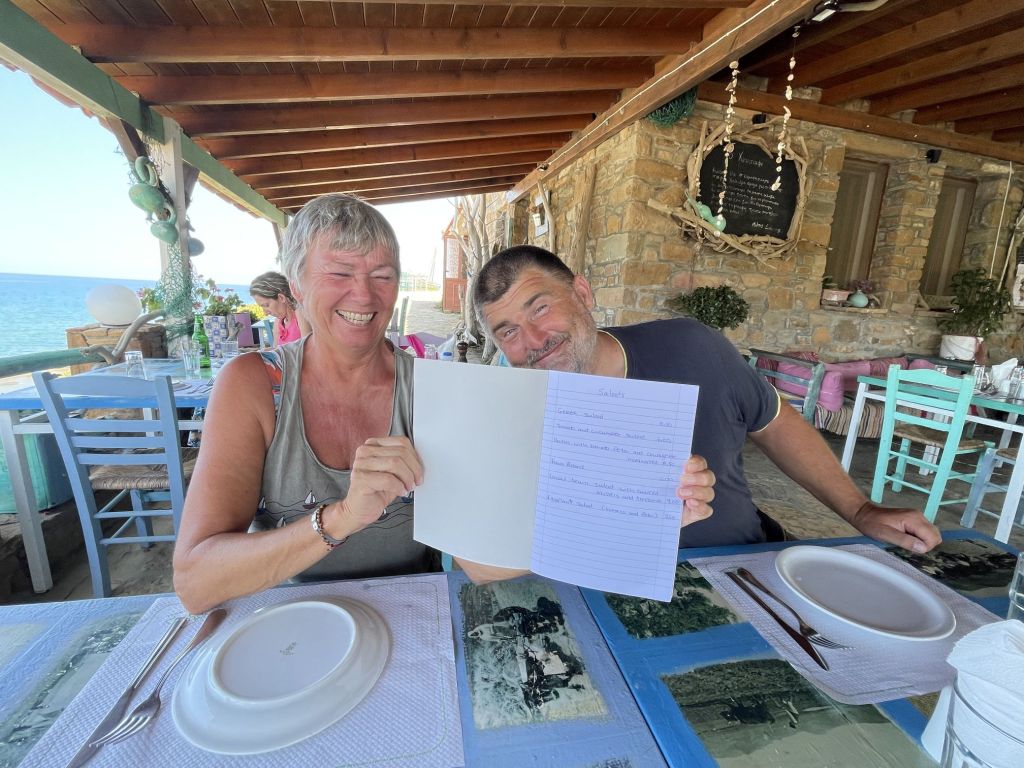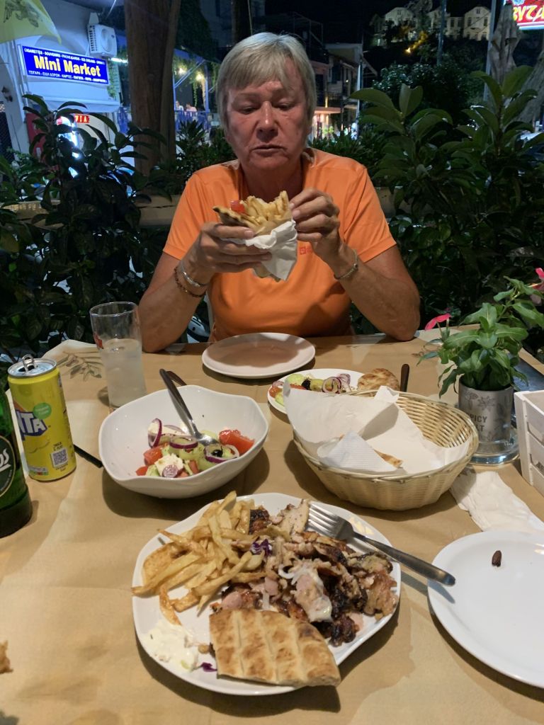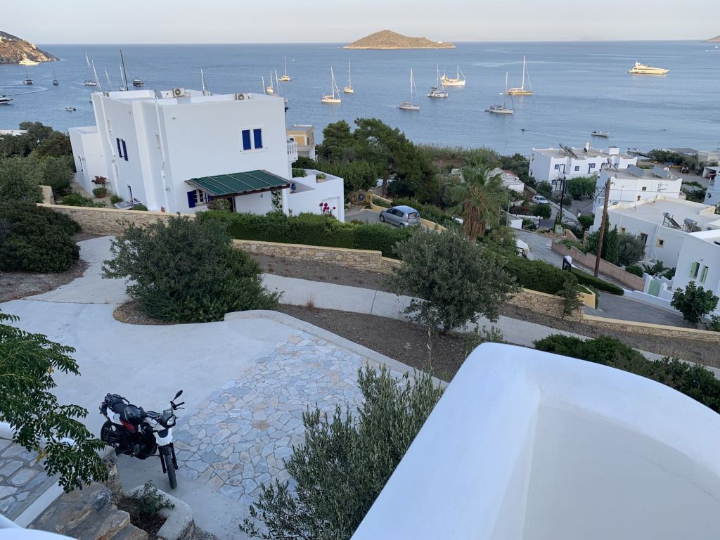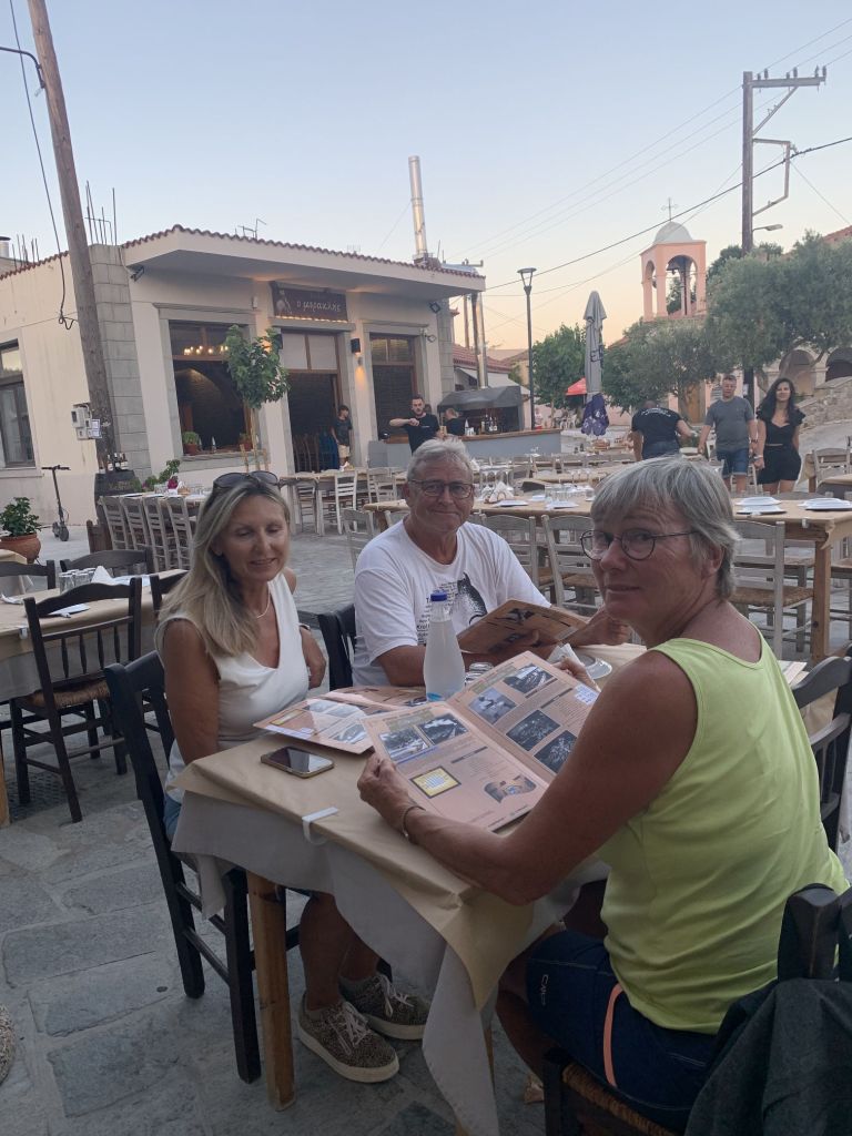 Zum Dinner sind wir im Haus der Freunde Mireille und Roland geladen, Die Beiden sind die Crew der SUNNY SIDE UP und wollen mehr zu unserer Motorradtour hören – der vergangenen und der vom letzten Jahr. Sie werden spät im September Karpathos mit dem Roller besuchen und erhoffen sich Tips, die wir gerne geben.