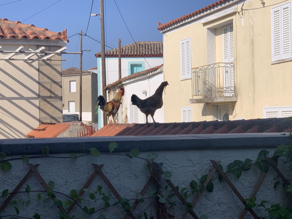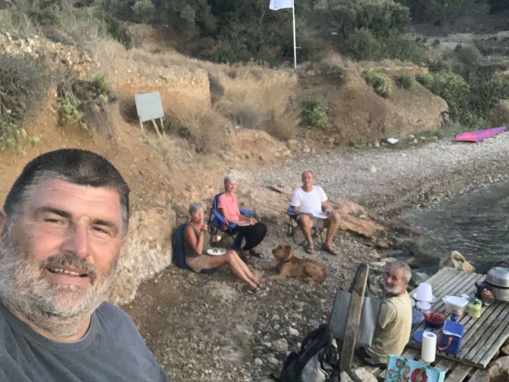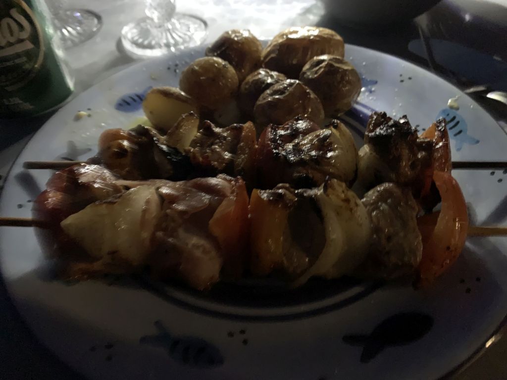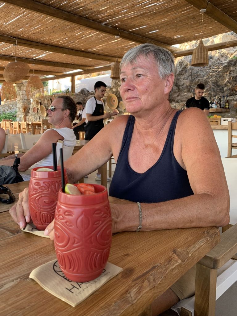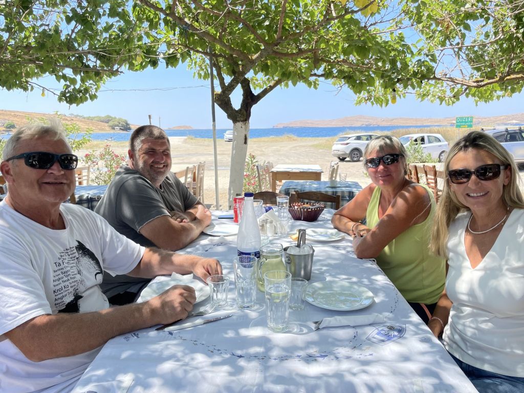 Zum Dinner sind wir im Haus der Freunde Mireille und Roland geladen, Die Beiden sind die Crew der SUNNY SIDE UP und wollen mehr zu unserer Motorradtour hören – der vergangenen und der vom letzten Jahr. Sie werden spät im September Karpathos mit dem Roller besuchen und erhoffen sich Tips, die wir gerne geben.