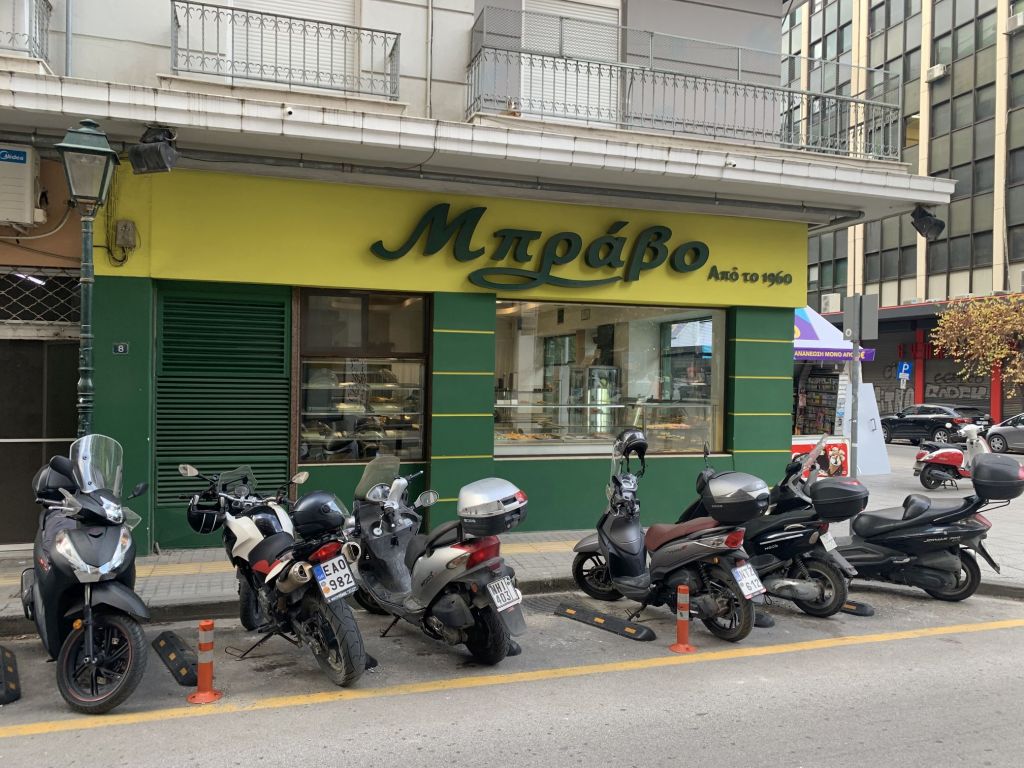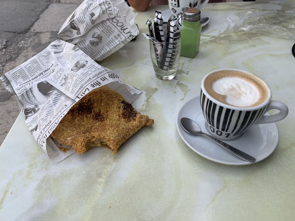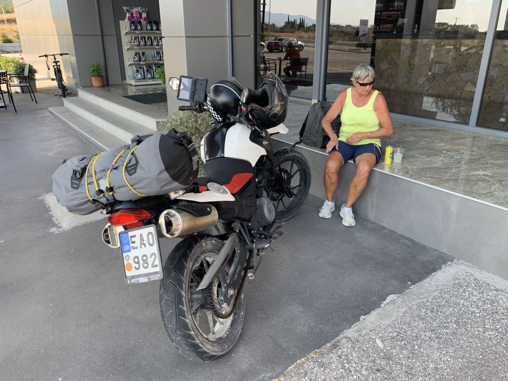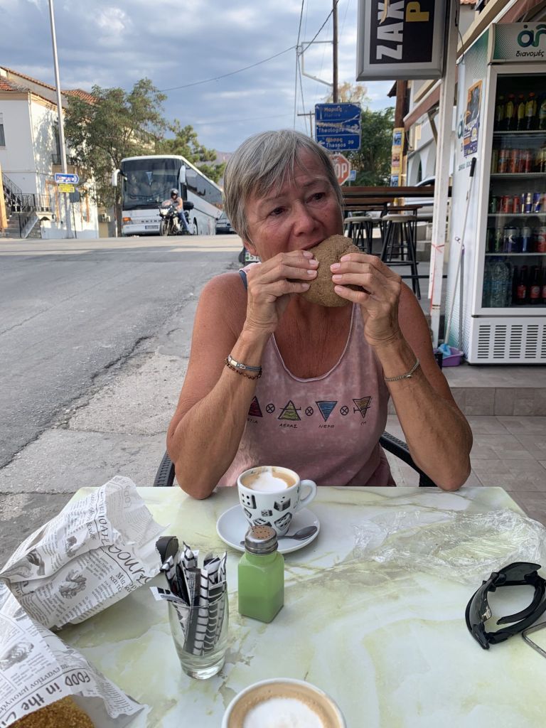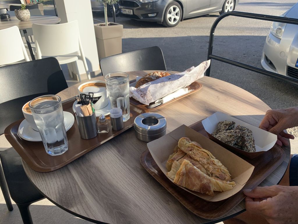 Am nächsten Morgen bepacken wir unsere treue Enduro ein letztes Mal. Wir fahren ins Zentrum von Chalkida und gehen bei der Bäckereikette „Gregories“ frühstücken. Normaler Weise würde ich kleinen Läden immer den Vorzug vor Ketten geben, aber „Gregories“ ist eine Hausnummer! Wir werden nicht enttäuscht und bekommen zum Abschluss die besten Sandwiches unserer Reise. Auch der Cappucchino ist ein Gedicht – Top Adresse!