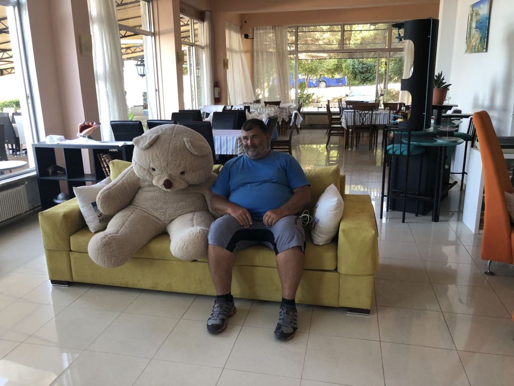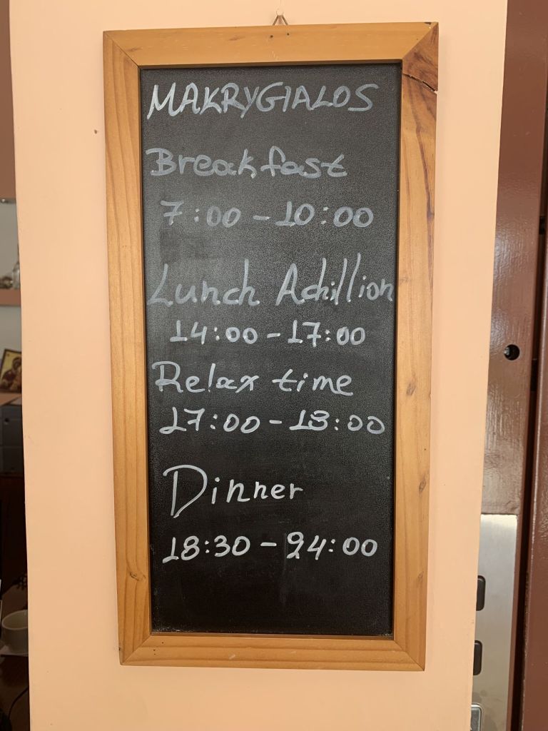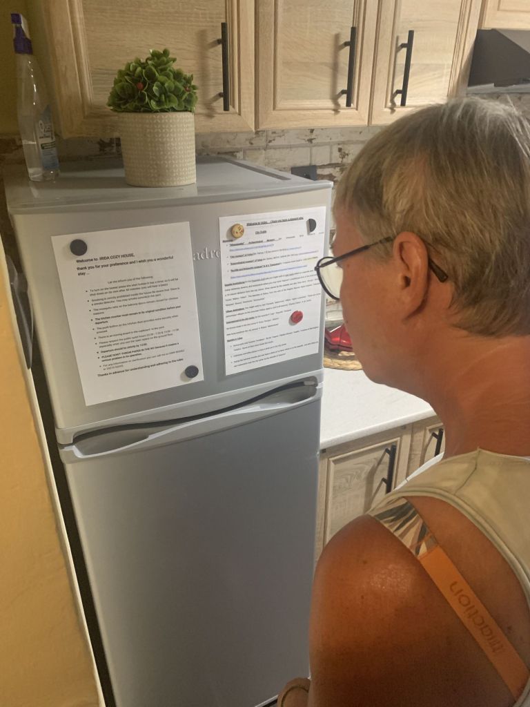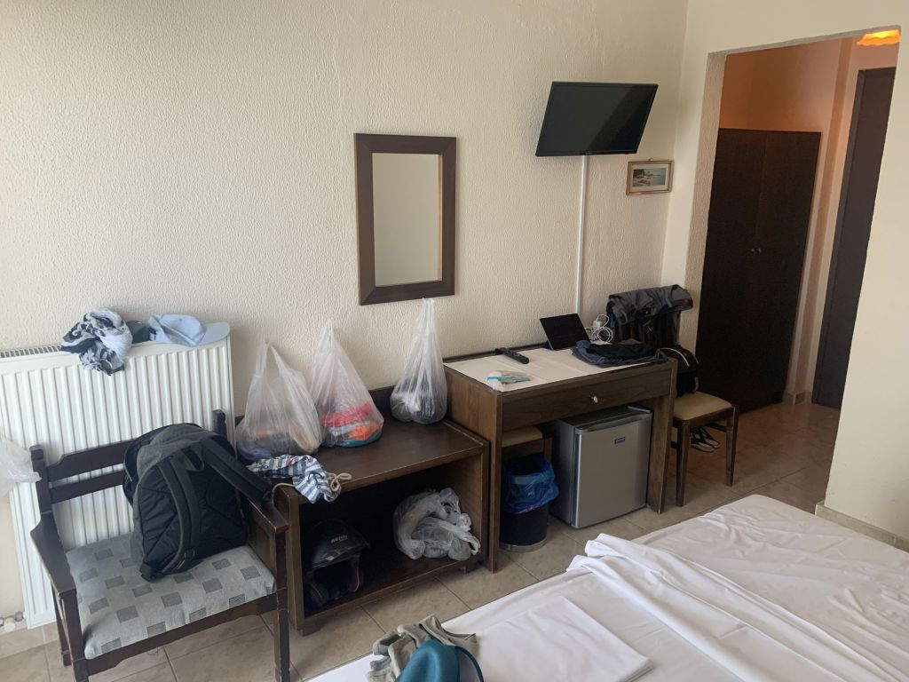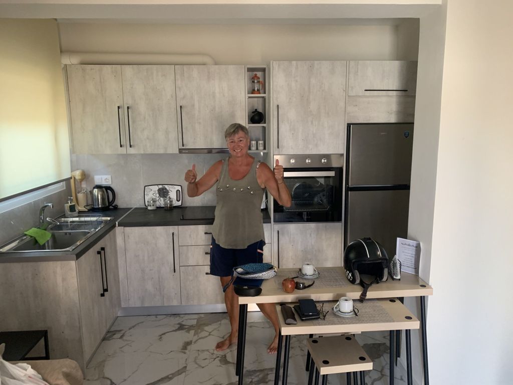 Eleni, die Gastgeberin, empfängt uns, sie heißt uns herzlich willkommen. Sie ist eine sehr nette und hilfsbereite Frau. Sie führt uns in unser Appartement, erklärt uns alles und weist auch auf unsere Nachbarn, „eine sehr nette Familie aus Moldawien“, hin.