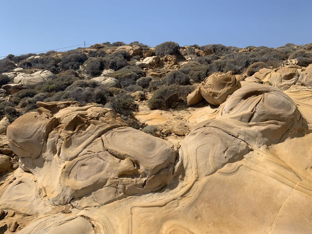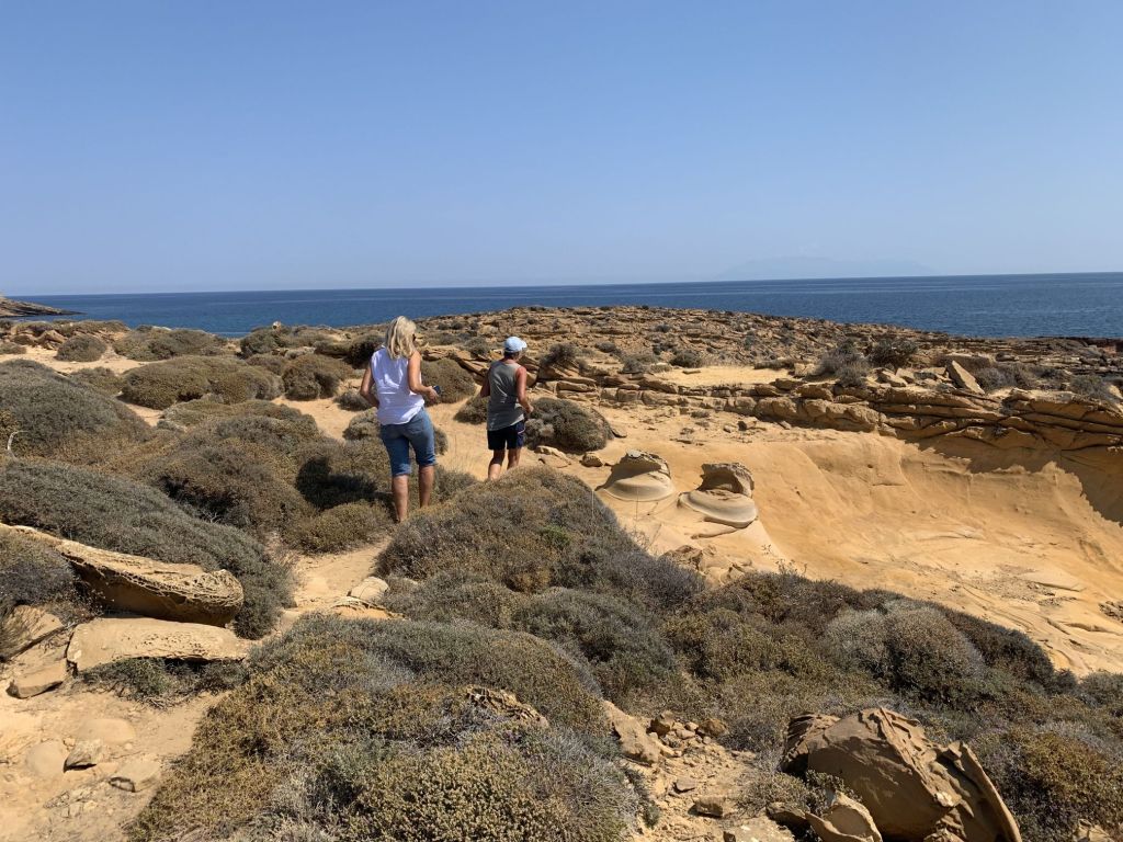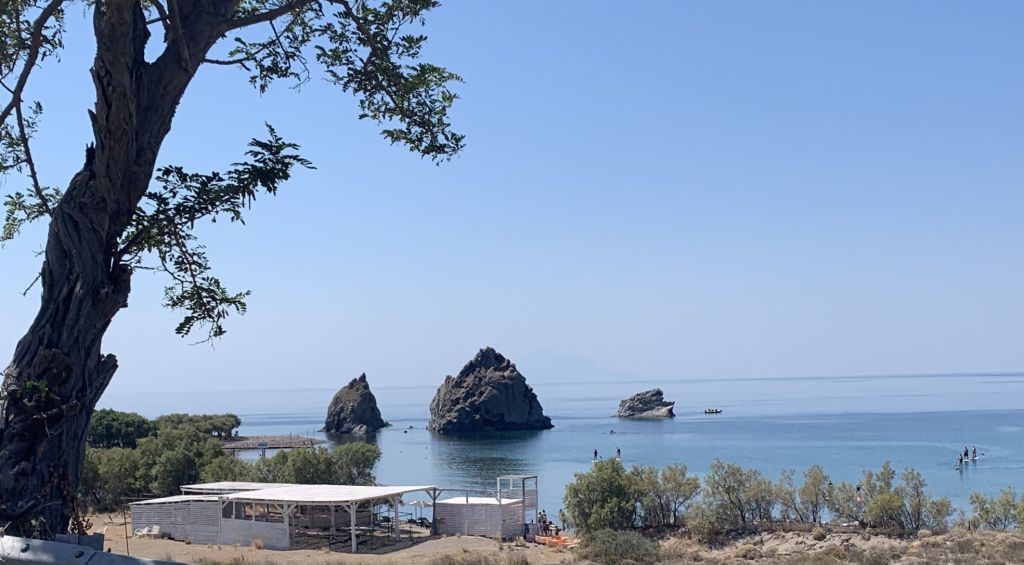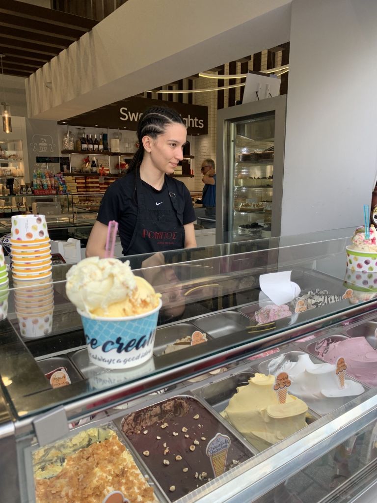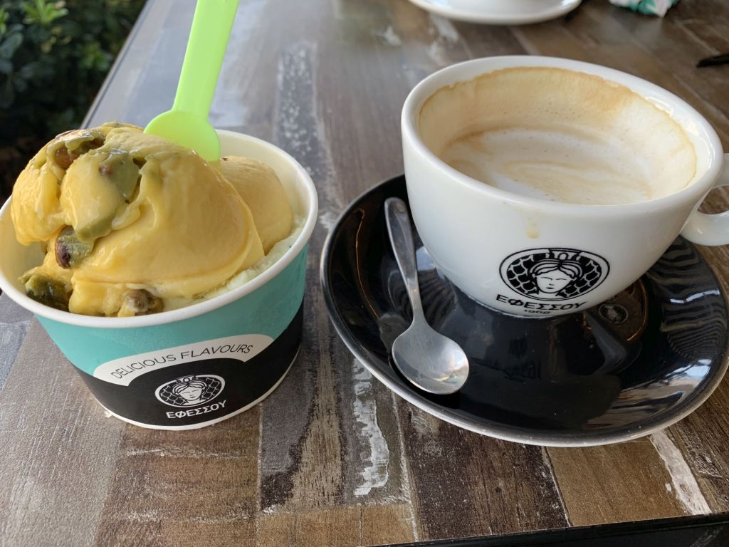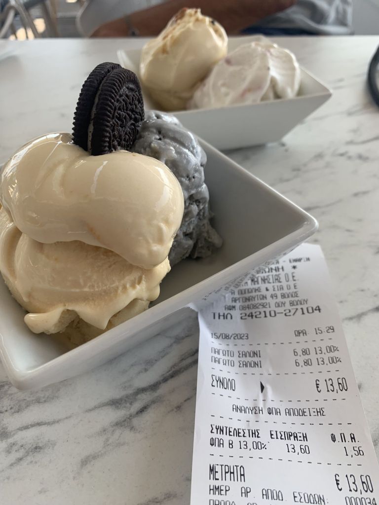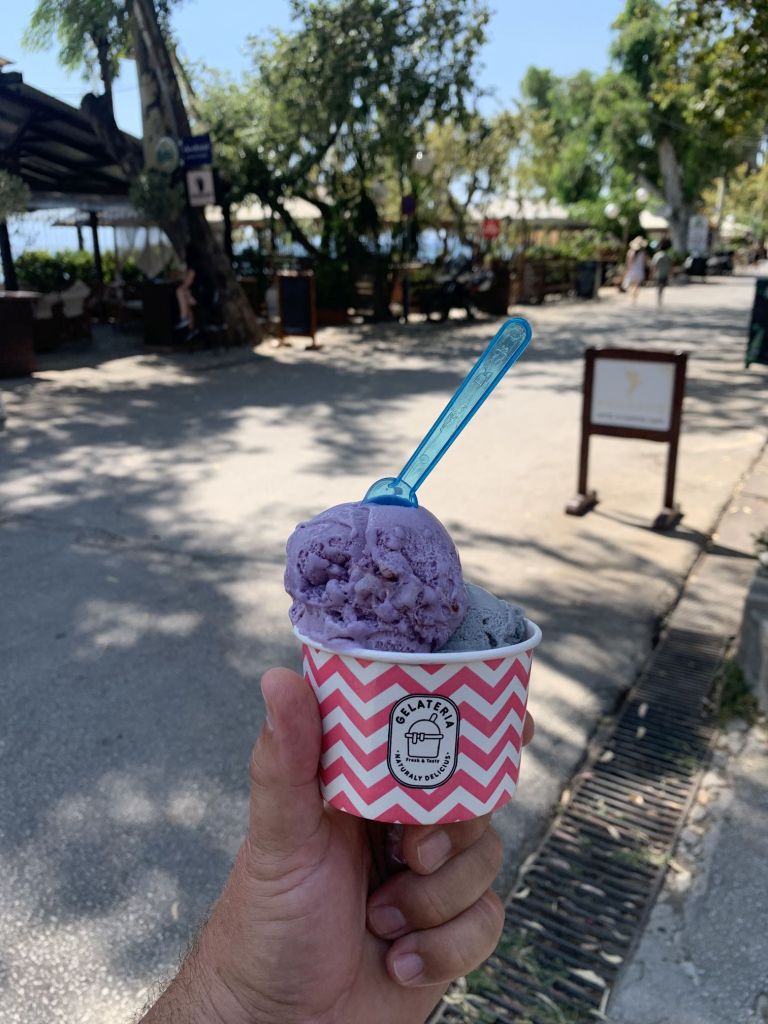 Am Morgen schäle ich mich gerädert von der Salonbank – wir rufen einen Ruhetag aus. Wir frühstücken und fahren an den Panteli Strand zum baden. Um die Ausschüttung von Glückshormonen zu forcieren, gönnen wir uns mal wieder ein Eis im „Sorbet“…