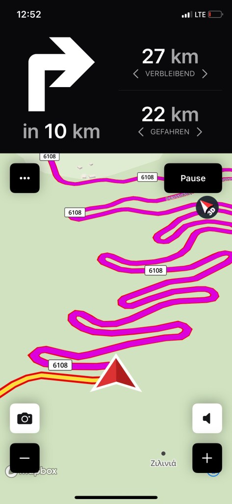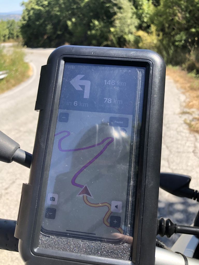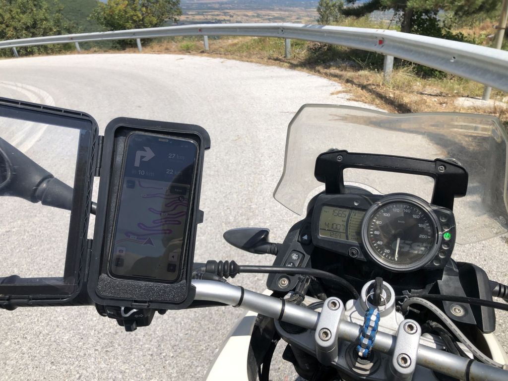 Ich habe die Route immer zuerst grob geplant – dies mit Hilfe von Google Maps ohne Autobahnen und Mautstraßen. Dann habe ich diese Route mit Hilfe einer Motorradapp für schöne und kurvige Straßen abgeglichen. Wir haben dann die Mehrkilometer betrachtet, abgewogen und ggf. leicht angepasst. So waren wir mit „Calimoto“ perfekt unterwegs – immer auf, ich entschuldige mich für das Wort, kleinen geilen Sträßchen, meist alleine, so dass wir unseren Stil fahren konnten. Perfekt! Zudem ist „Calimoto“ besser ablesbar und offline, so konnte ich Daten sparen! Der Halter für´s Handy am Lenker war daher überfällig…