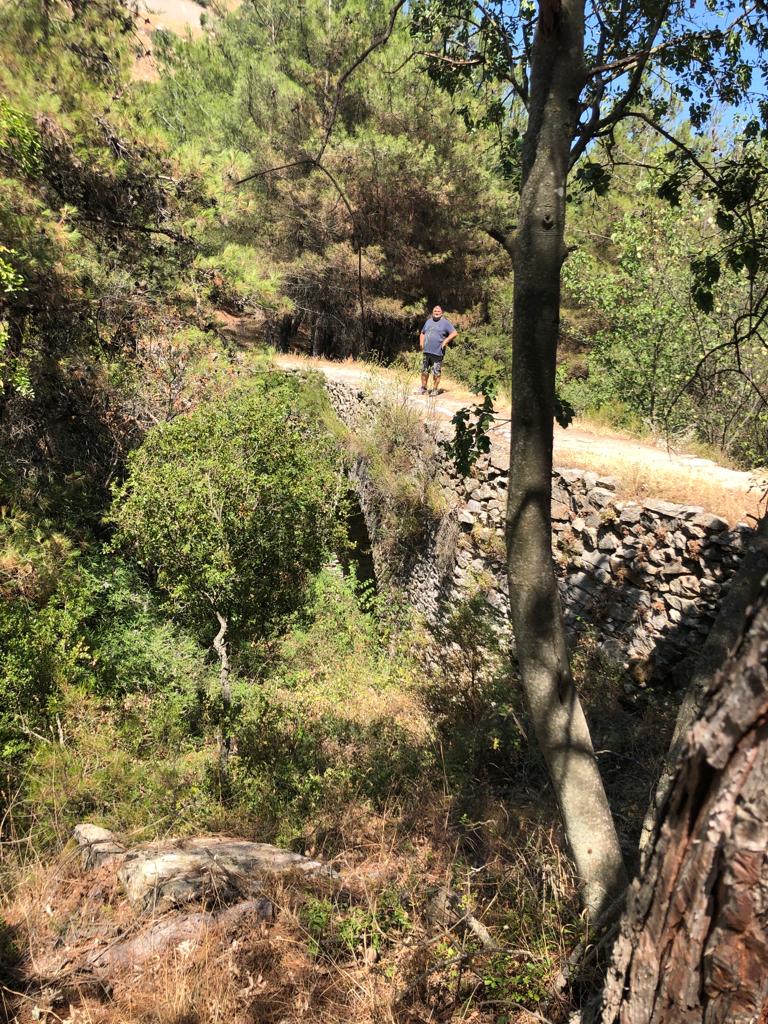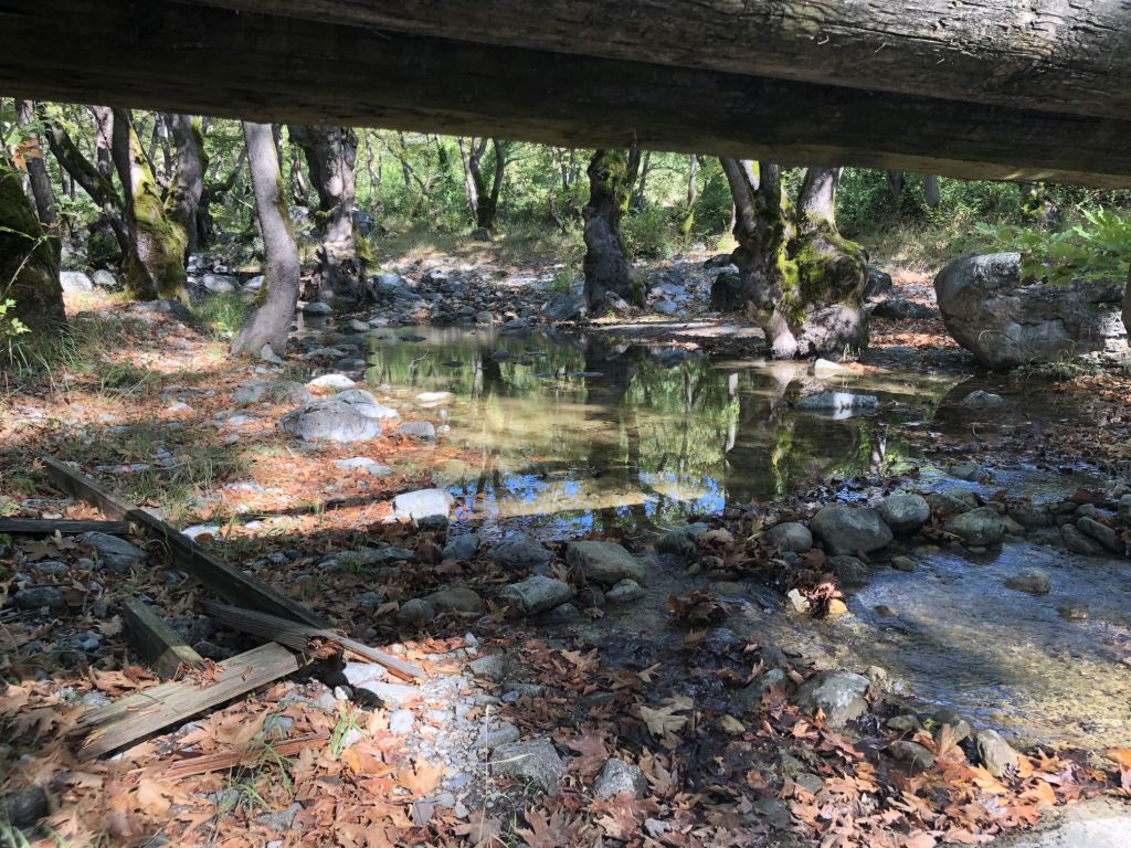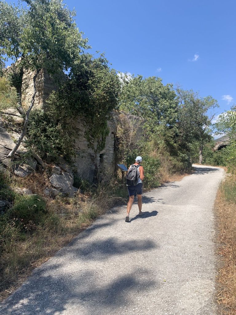Wir liefen eine Weile, ich glaube es waren 4 der 6,3km geschafft, als Sibylle zum Stop rief. Ein Blick von den Brücken zeigte deutlich, dass unser Marsch zur Quelle ein vergeblicher sein würde – der Bach führte zu dieser Zeit kein Wasser. Zudem hatten wir kein Trinkwasser dabei und der Schatten war nicht so ausgeprägt wie versprochen – es bot sich an umzukehren! Ich gaukelte Enttäuschung vor, trat dann aber mit meiner Gattin den Rückweg an…