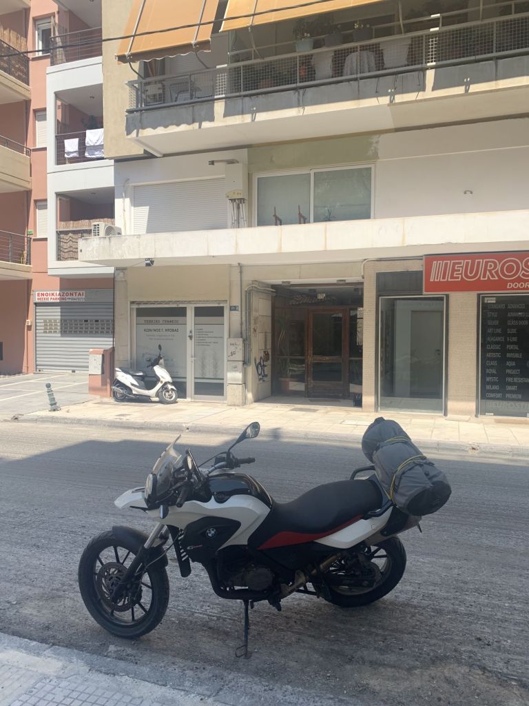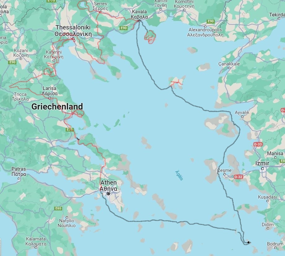 Zwei Informationen sind jetzt wichtig! Zum einen, der Weg vom Hafen bzw. Citycenter zur Wohnung und der von der Stadt zum Waterway Trail summierten sich bisher auf etwa 35km, dazu kommen jetzt der Hin- und Rückweg nach Nea Peramos, also rund 40km. Am nächsten Tag habe ich getankt und alle meine Kilometerzähler auf Null gesetzt – es müssen daher zu allen gesamt gefahrenen Kilometerangaben etwa 75km dazuaddiert werden.