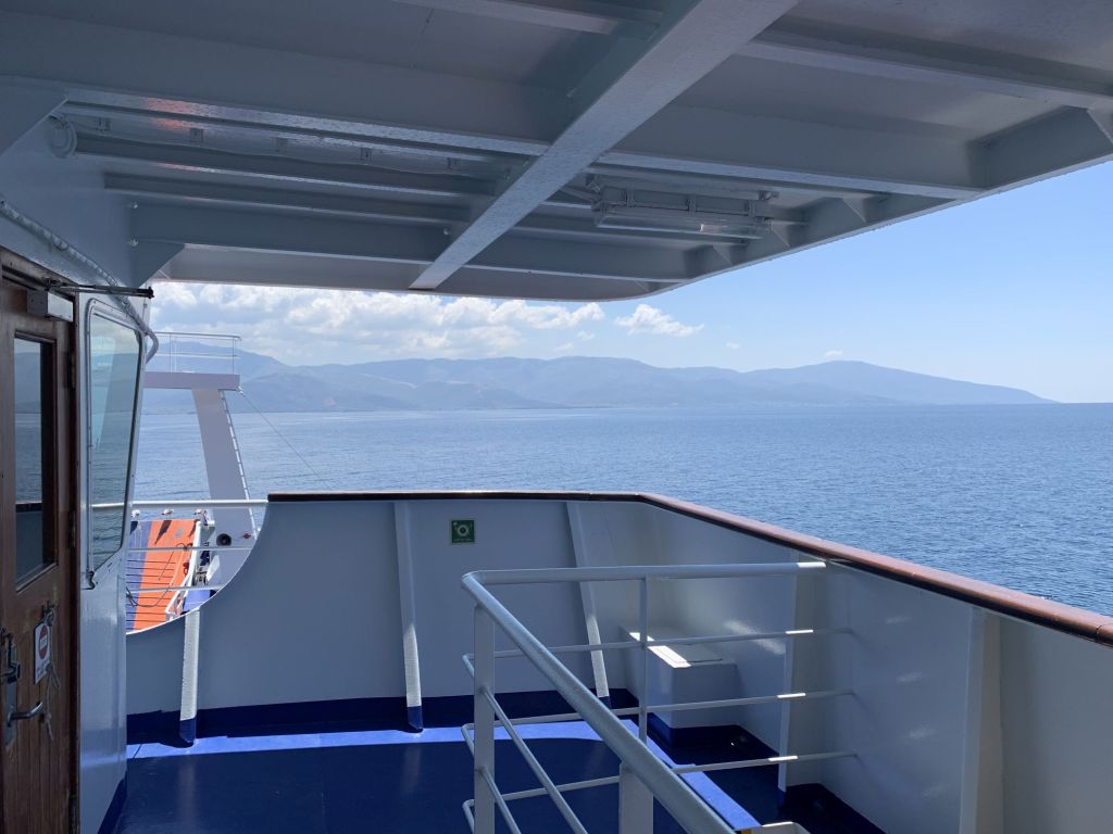 Die Fähre war hier noch sehr spärlich besetzt. Dies hat uns die Gelegenheit gegeben, dass wir den Platz mittels Rucksack „reservieren“ konnten und zur Verabschiedung von unserer Heimatinsel auf´s Oberdeck verholten.