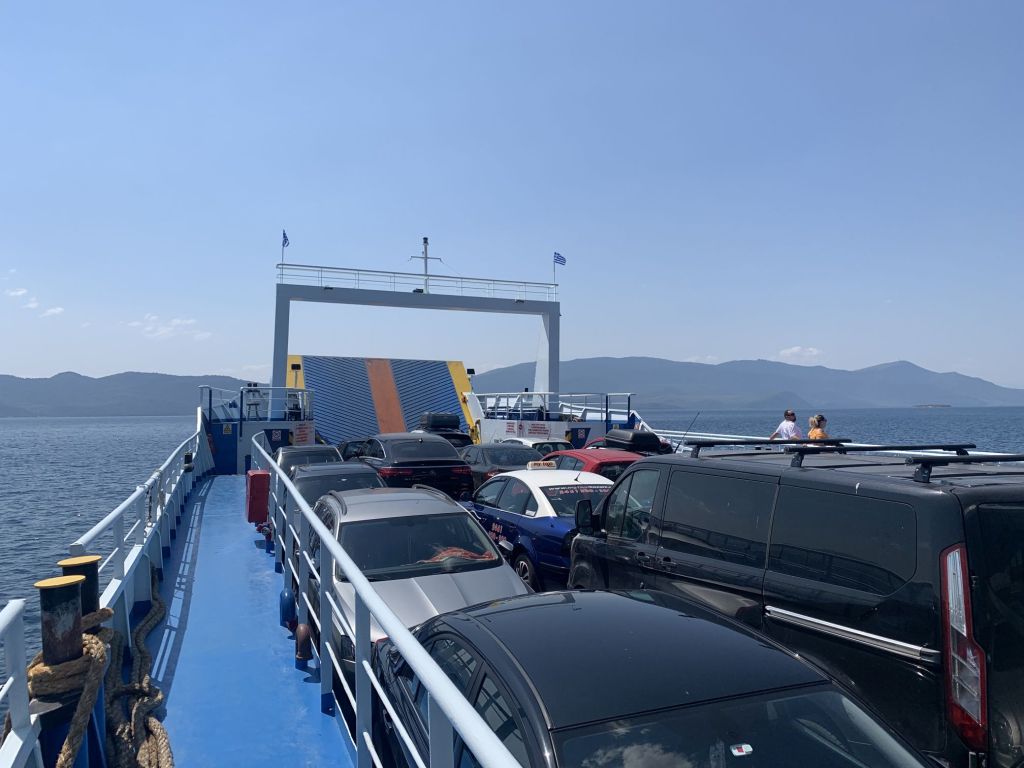 Sibylle war, wie immer, schon als Fußgängerin an Bord gegangen und hatte uns einen schönen Platz am Fenster gesichert. Ich habe sie rasch gefunden und mich zu ihr gesetzt. Ok, ein paar Autos müssen noch rein, dann geht es los – wir setzen über nach Thassos.