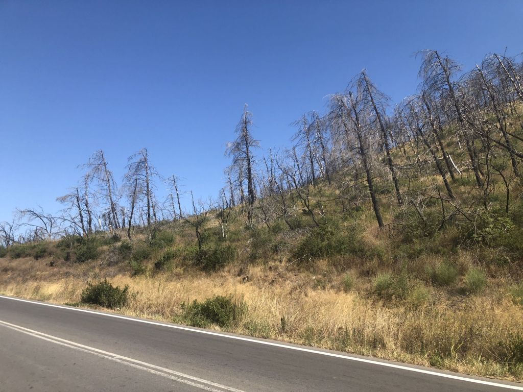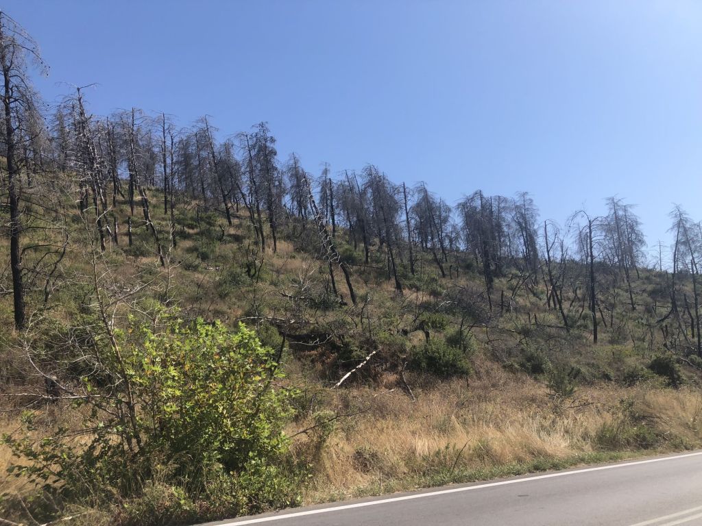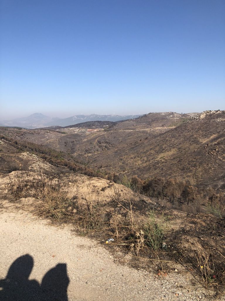 Auf ziemlich exakt halbem Weg erreichen wir den Kamm des Bergrückens und trauen unseren Augen kaum – die andere Seite des Berges war ebenfalls vor zwei Jahren von den schweren Bränden betroffen und gleicht auch heute noch einer Mondlandschaft.