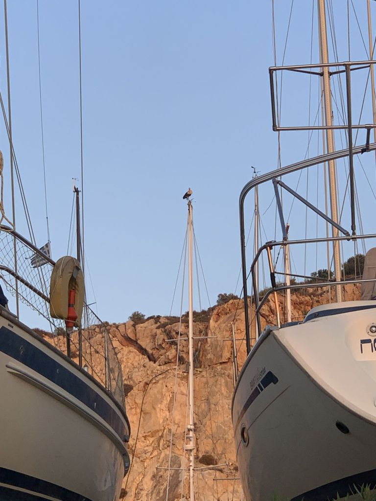 Ich werde aus meinen Gedanken gerissen – jemand hat Störche in der Marina gesehen! Tatsächlich! Ein Schwarm Störche hat sich unsere Heimatmarina als Zwischenstop auf dem Weg in den Süden ausgesucht. Die Vögel lassen sich überall nieder – an bequemen und unbequemen Orten…