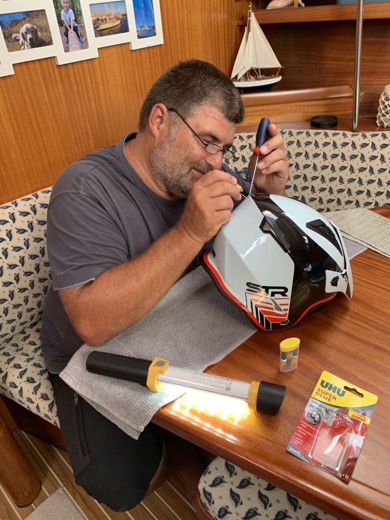Es löst sich ein Gitter einer Luftführung für die Belüftung – nicht sicherheitsrelevant, aber es sieht doof aus. Das will ich nicht, ist der neue Kopfschutz doch erst zwei Tage alt. So greife ich zu Kleber und Werkzeug und repariere das NEUE Trum!