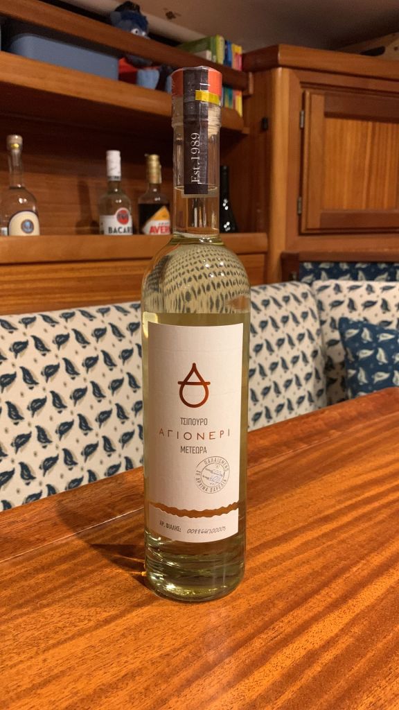 Als wir an Bord zurückkommen, steht eine gute Flasche Tzipouro an Bord von NESSAJA – ein Dankeschön der ALLEGRA Crew. Auch von ihnen hatten wir uns verabschiedet, sie wollten die Segelsaison ausklingen lassen. Leider sollte dies anders kommen, wegen einiger kleinerer Defekte kamen sie bald schon in die Marina zurück.