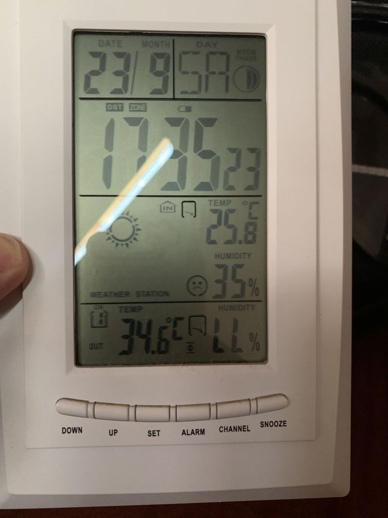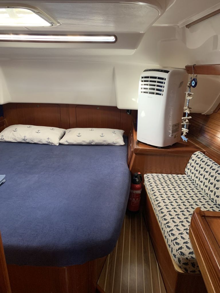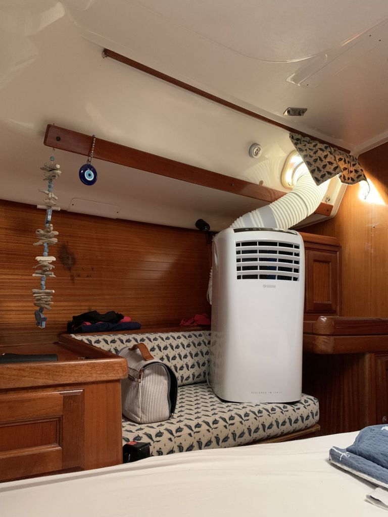 Ich kaufe das Ding also für vertretbare 160.-€ und bringe es mit Hans-Peters Hilfe auf unser Schiff. Der erste Testlauf unter nicht optimalen Bedingungen zeigte, dass ich innerhalb vier Stunden in der Lage bin unsere Kabine von fast 35°C auf letztlich erreichte 20°C runterzukühlen – das war fast ein bisschen kalt.