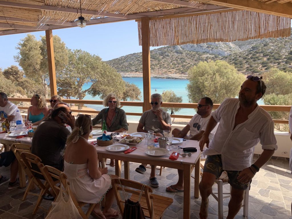 Wir vermelden Freund Marcus unsere Ankunft und verabreden uns bei ihm am Haus. Dann fahren wir gemeinsam auf die andere Inselseite – dort hat Marcus eine komplette Terrasse einer Taverne in einer sehr feinen Bucht für sich reserviert – das Flair ist fast karibisch…