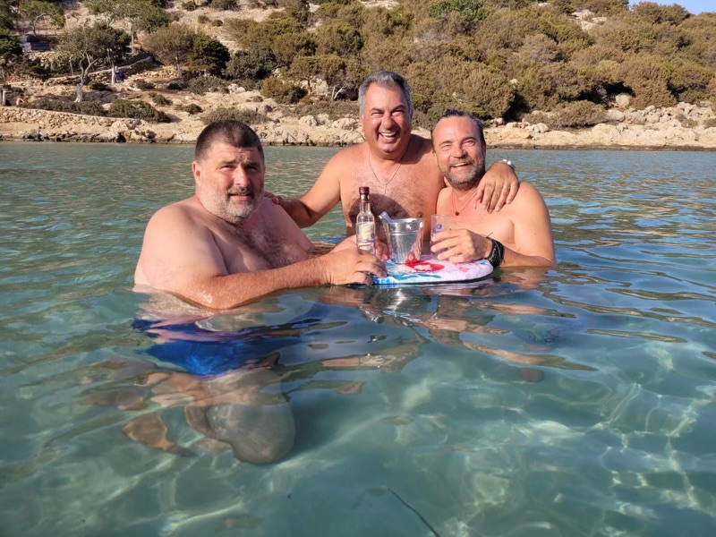 Volker und ich setzen uns auf die Badeplattform – es gibt etwas zu besprechen. Wir schnappen uns einen gehörigen Vorrat „Mythos“ und beginnen Pläne zu diskutieren…