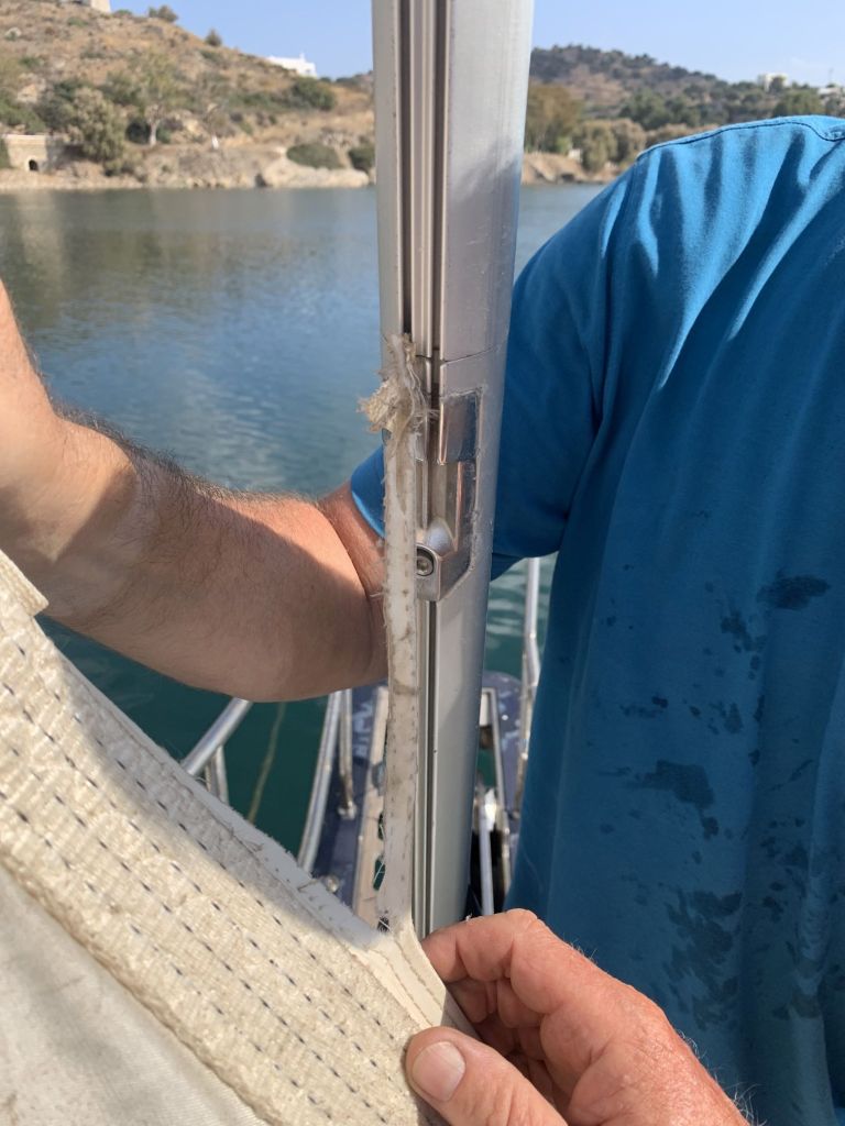 Alles klappt vorzüglich und unspektakulär. Der Segelmacher Sotiris kommt noch einmal um ein Maß abzunehmen, bevor er das neue, wasserdichte Segelkleid fertigstellt. Danach sind wir mit Giorgos verabredet, ELOWYN soll auch einen Solarträger erhalten, auch er muss Maße abnehmen und sich ein Bild verschaffen.