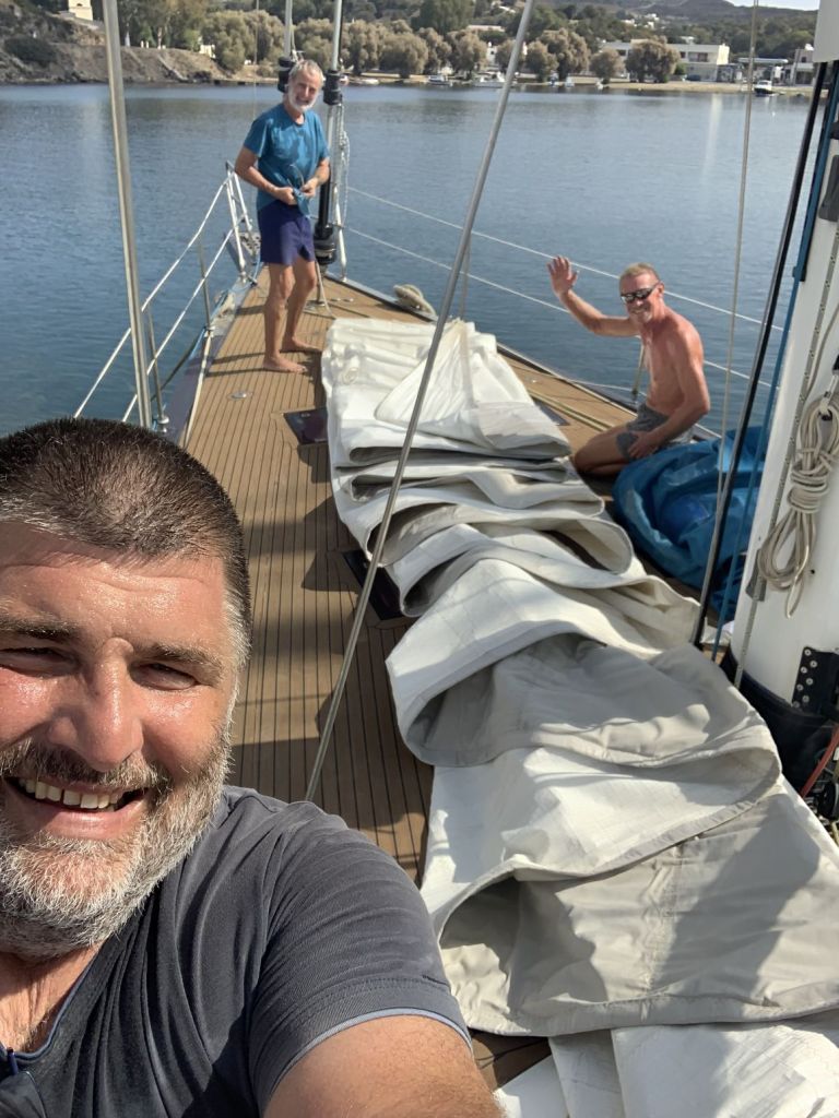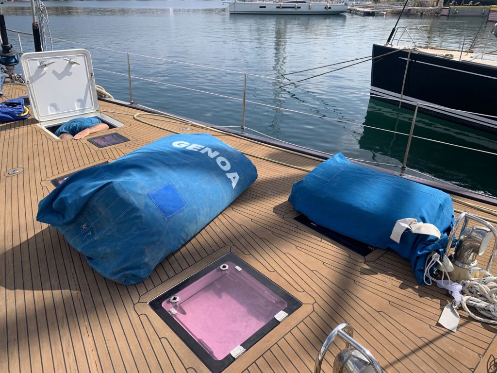 Das Tuch, das lässig 200kg wiegt, ist kaum zu bändigen, wir brauchen einen dritten Mann! Zusammen mit Benno von der CARPE DIEM rollen wir das riesige weiße Tuch aus und öffnen das Genuafall – schon rauscht das Monster auf´s Deck.
