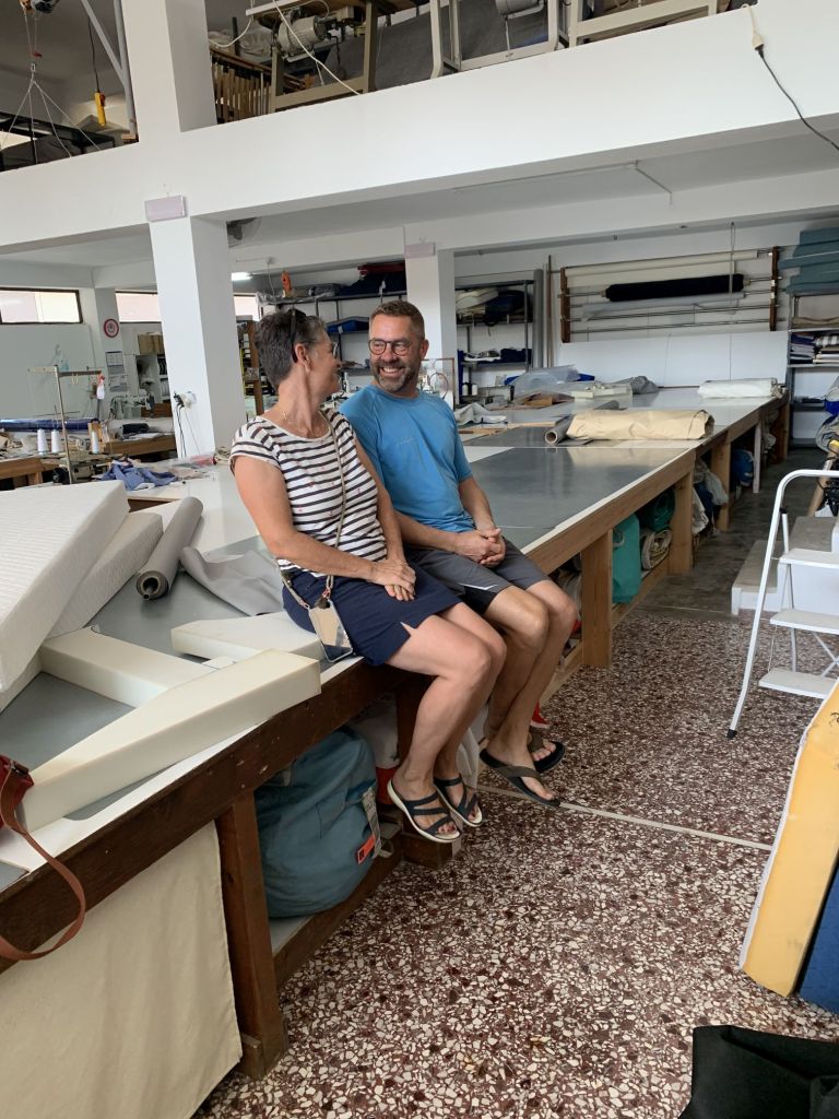 Der Grund dafür war banal, es musste seitens des Segelmachers eine Messung vorgenommen werden, Volker und Tina hingegen hatten im Shop des tapferen Schneiders noch einen Polsterstoff und ein Schaummaterial für die Sitzfläche auszusuchen – dafür ist eine Sitzprobe unumgänglich.