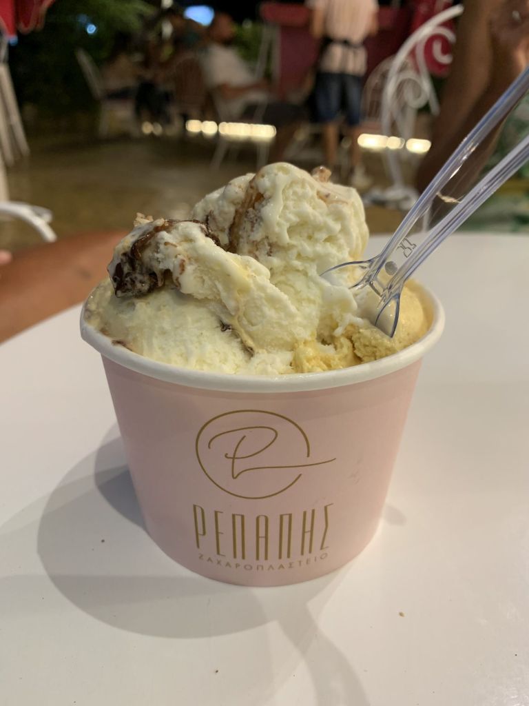 Wir haben neue Gedanken im Kopf – wir müssen uns besprechen und gönnen uns ein Eis! Nein, nicht bei „Repapis“ – zur Abwechslung für uns und für euch mal im „To Paradosiako“ – die zartschmelzende Köstlichkeit ordern wir nebst einer Kuchenbegleitung…