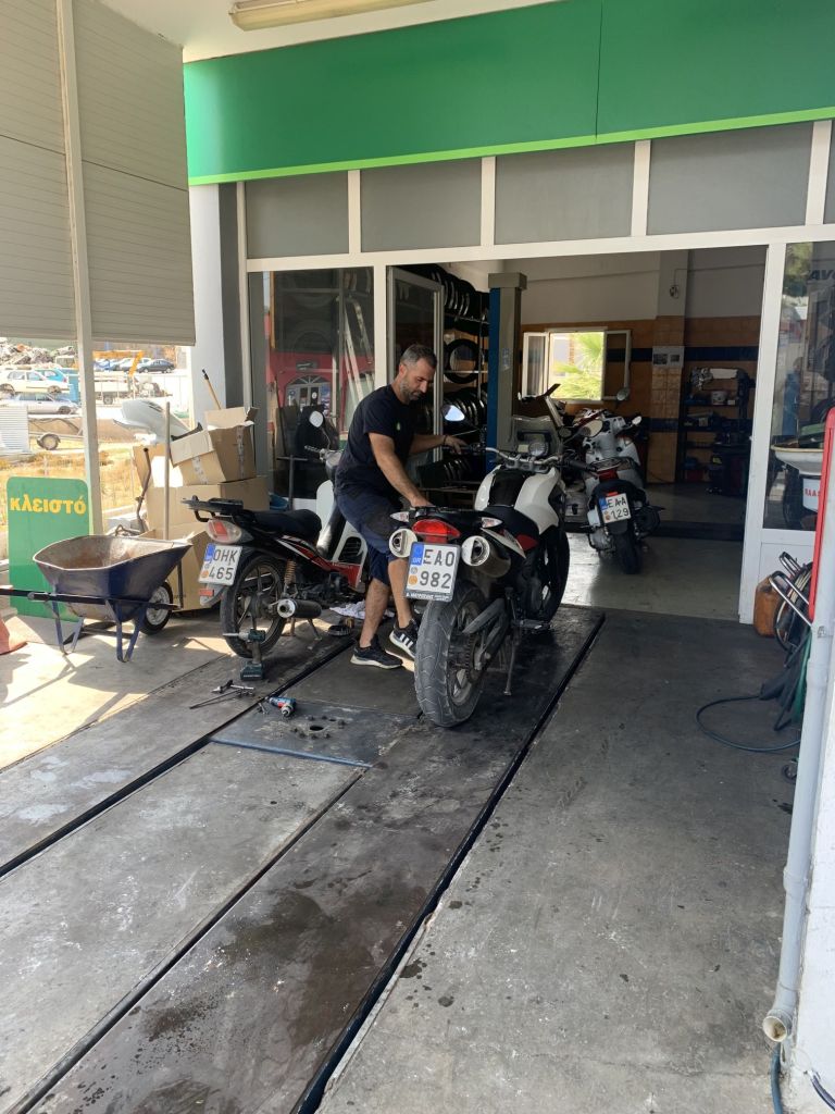 Wir freuten uns über den Anruf von Vivi – unsere Reifen sind angekommen, Maximos würde diese sofort montieren – also nix wie hin!
